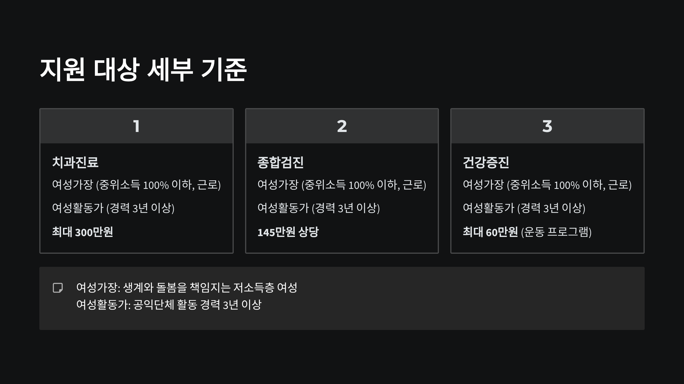 ① 치과진료 여성가장(중위소득 100% 이하, 근로) 및 여성활동가(경력 3년 이상) 1인 최대 300만원 이내
