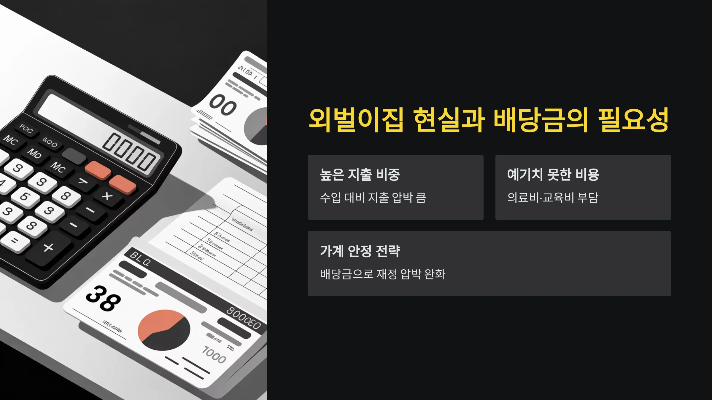 맞벌이가 점점 보편화되고 있는 시대지만, 여전히 많은 가정이 외벌이로 생계를 유지하고 있습니다. 외벌이집은 수입 대비 지출 비중이 높고, 예기치 못한 의료비·교육비 등으로 인한 재정 압박도 큽니다. 이런 상황에서 외벌이집 월100만원 배당금 비결은 단순한 투자 기법을 넘어 가계 안정 전략이기도 합니다.