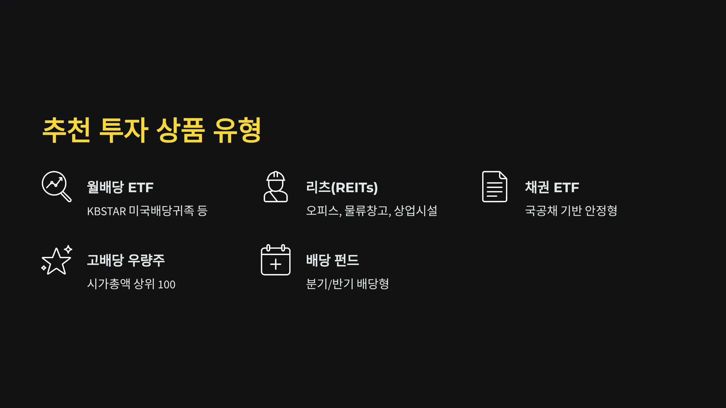 은행 예금만으로는 절대 만들 수 없는 구조이므로 ETF, 리츠, 채권형 펀드 등을 병행해야 합니다.