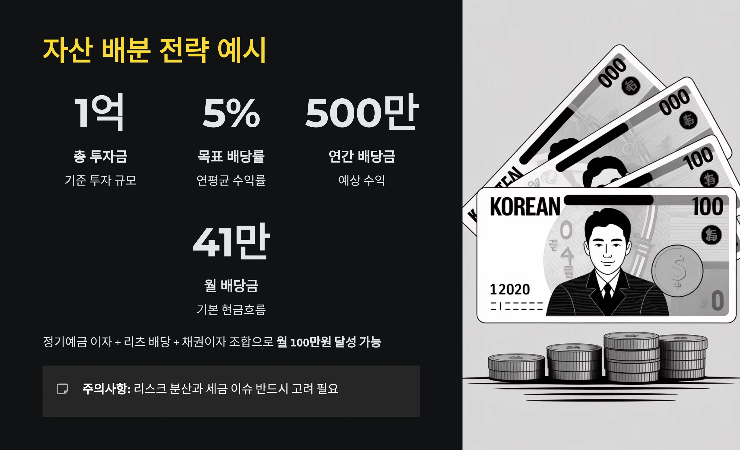 예를 들어 총 투자금 1억 원 기준으로, 배당률 평균 5%를 목표로 한다면 연 500만 원, 월 약 41만 원 정도가 됩니다. 여기에 정기예금 이자, 리츠 배당, 채권이자 등을 조합하면 외벌이집 월100만원 배당금 비결이 실현 가능합니다. 다만 리스크 분산과 세금 이슈도 반드시 고려해야 합니다.