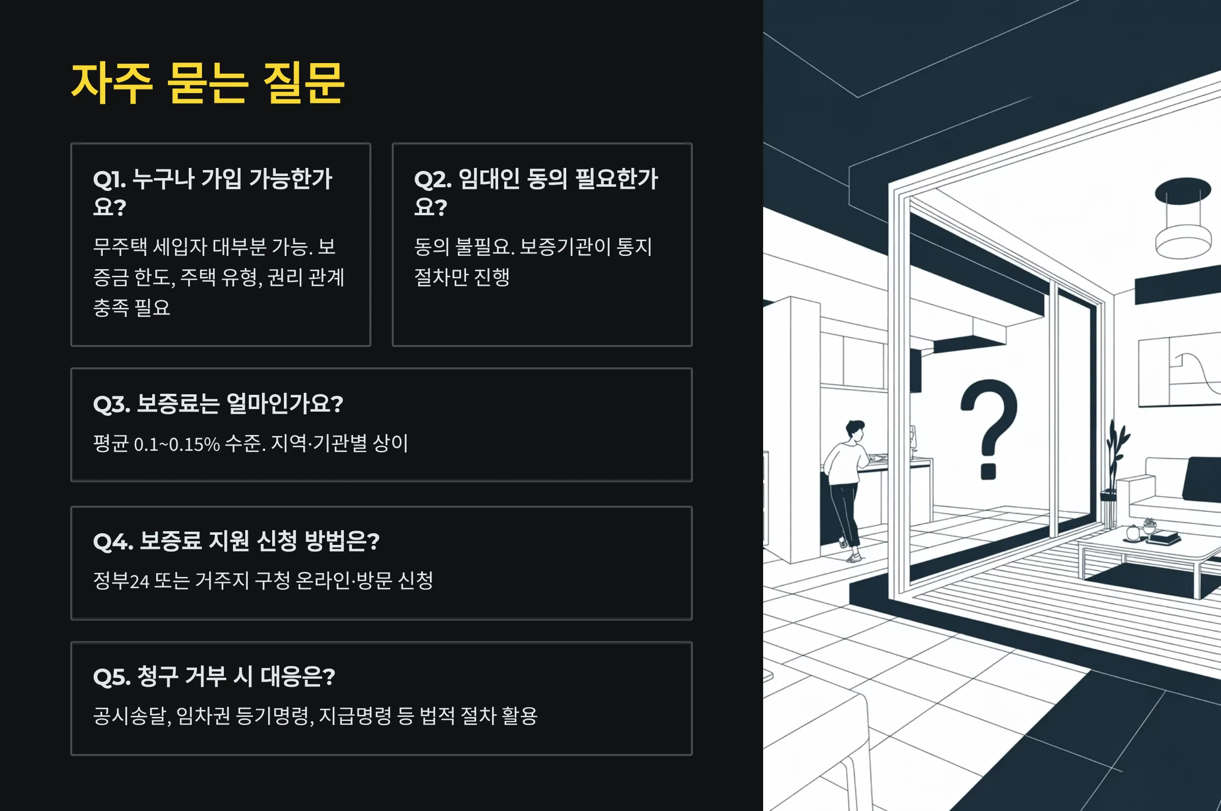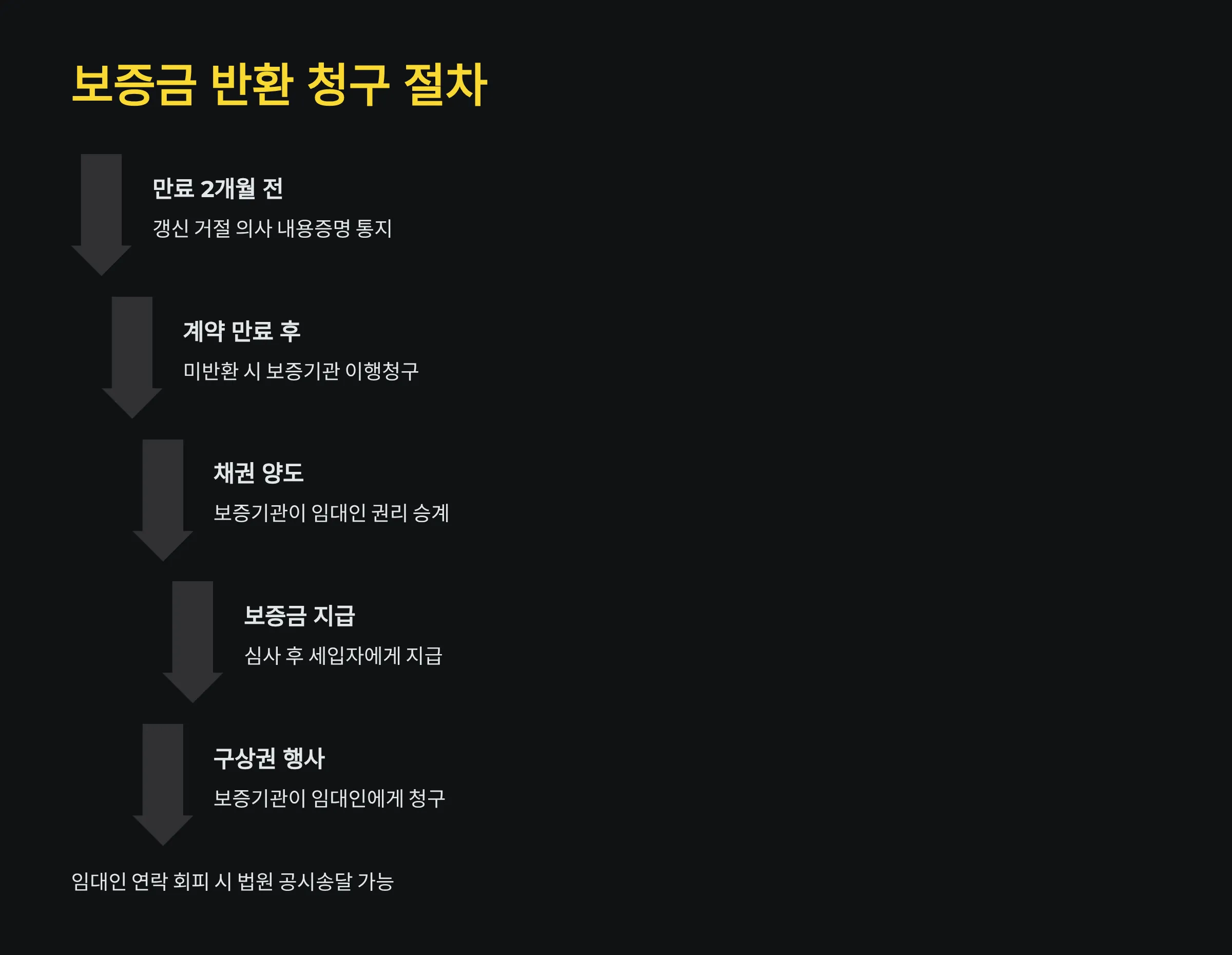 5) 임대인이 연락을 회피하거나 수령을 거부하면, 법원 공시송달을 통해 통지할 수 있습니다. 보증기관별 청구 절차가 다르므로 반드시 이행 시기와 서류 목록을 확인해야 합니다.