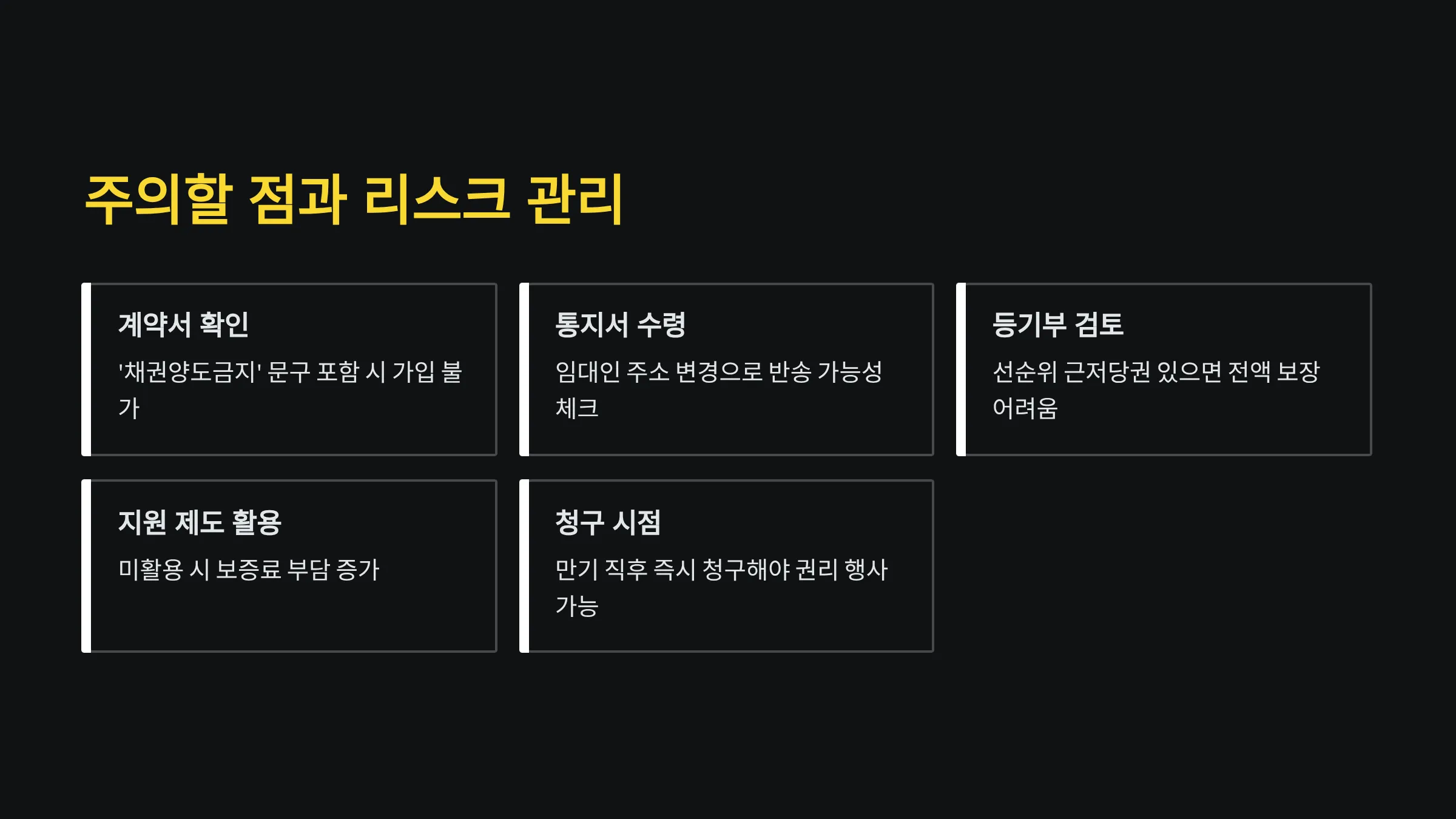 전세보증금 반환보증보험을 가입할 때는 몇 가지 주의할 점이 있습니다. 임대차계약서에 ‘채권양도금지’ 문구가 포함되어 있으면 가입이 불가능할 수 있으므로 반드시 확인해야 합니다. 또한 임대인의 주소지 변경으로 통지서가 반송될 가능성이 있으니, 내용증명 발송 후 수령 여부를 확인하세요. 선순위 근저당권이 있는 경우 보증금 전액 보장이 어려울 수 있으므로 등기부등본을 반드시 검토해야 합니다. 보증료 지원 제도를 활용하지 않으면 비용 부담이 커질 수 있으므로, 거주 지역의 지원 여부를 사전에 확인하는 것이 중요합니다. 계약 만료 후 청구 시점을 놓치면 권리 행사가 제한될 수 있으므로, 만기 직후 즉시 보증기관에 청구해야 안전합니다.