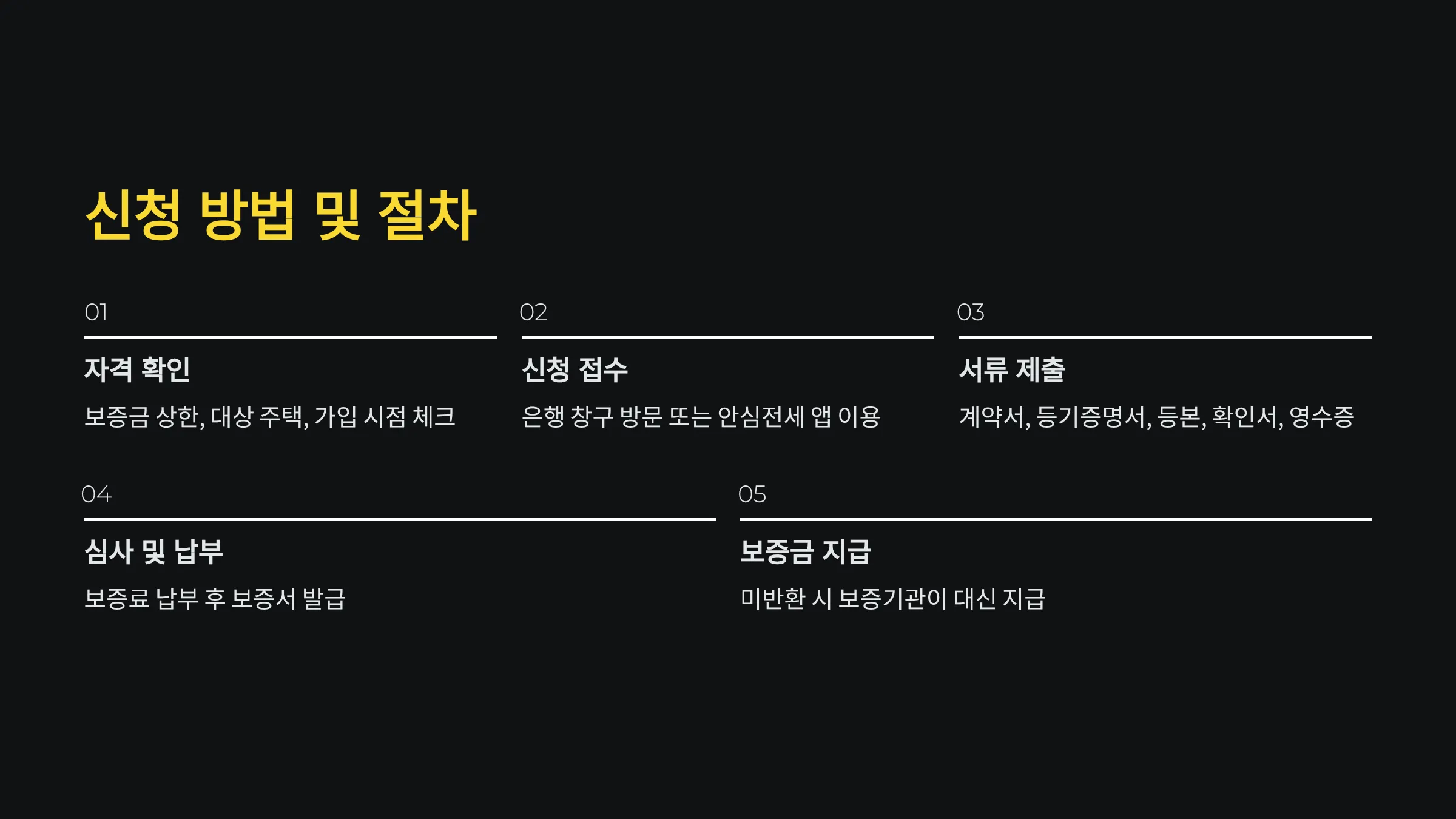 2) 방문 신청은 은행 창구 또는 보증기관 지사에서 진행하며, 온라인 신청은 안심전세 앱, 모바일 보증 플랫폼 등을 통해 가능합니다.