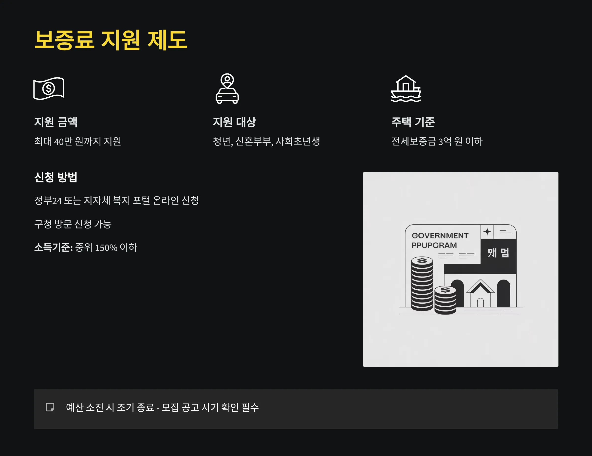 전세보증금 반환보증보험의 보증료는 세입자가 납부해야 하지만, 일부 지자체에서는 보증료 지원 제도를 운영합니다. 서울시, 인천, 경기 등 주요 지역에서는 청년, 신혼부부, 사회초년생을 대상으로 최대 40만 원까지 지원합니다. 신청은 정부24 또는 각 지자체 복지 포털을 통해 가능하며, 방문 신청도 가능합니다. 지원 대상은 전세보증금 3억 원 이하의 주택에 거주하는 무주택 세입자, 소득기준 중위 150% 이하인 가구가 주로 해당됩니다. 단, 예산 소진 시 조기 종료될 수 있으므로 모집 공고 시기를 꼭 확인해야 합니다.