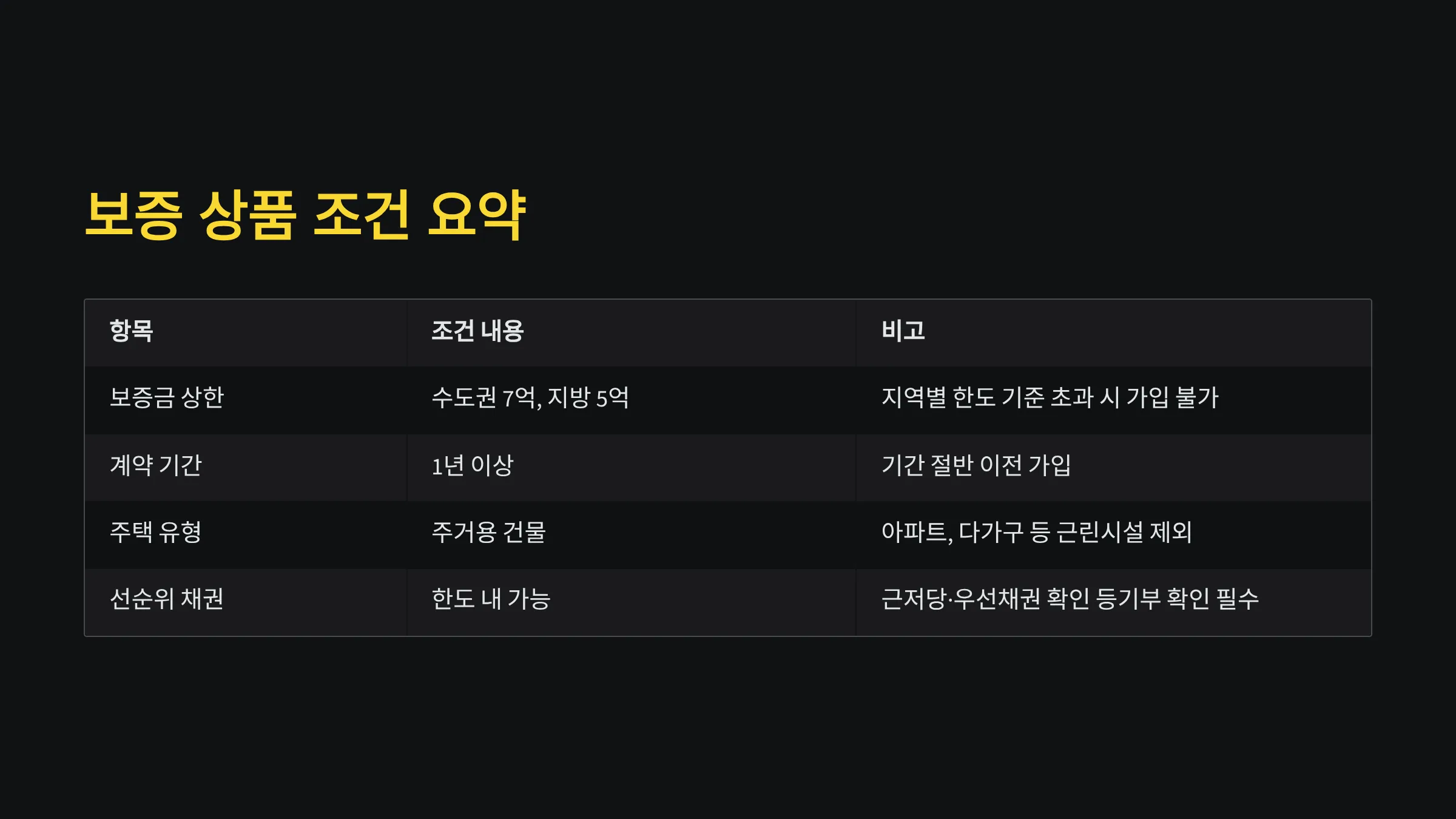보증금 상한 수도권 7억, 지방 5억 지역별 한도 기준 초과 시 가입 불가