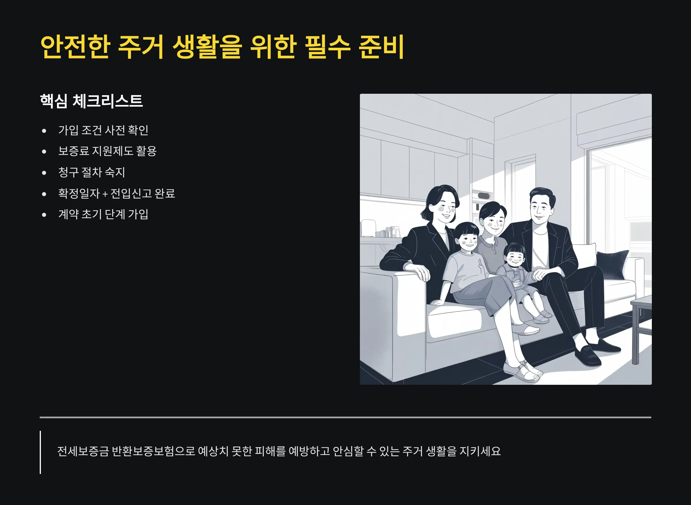전세보증금 반환보증보험은 세입자가 계약 만료 후 보증금을 안전하게 돌려받을 수 있도록 돕는 필수 제도입니다. 가입 조건을 미리 확인하고, 보증료 지원제도와 청구 절차를 꼼꼼히 숙지하면 예상치 못한 피해를 예방할 수 있습니다. 전세계약 전에는 확정일자, 전입신고, 특약 확인을 꼭 완료하고, 보증보험 가입 시기는 계약 초기 단계에서 진행하는 것이 가장 좋습니다. 이 글을 참고해 전세보증금 반환보증보험으로 안전한 주거 생활을 지켜보시기 바랍니다.