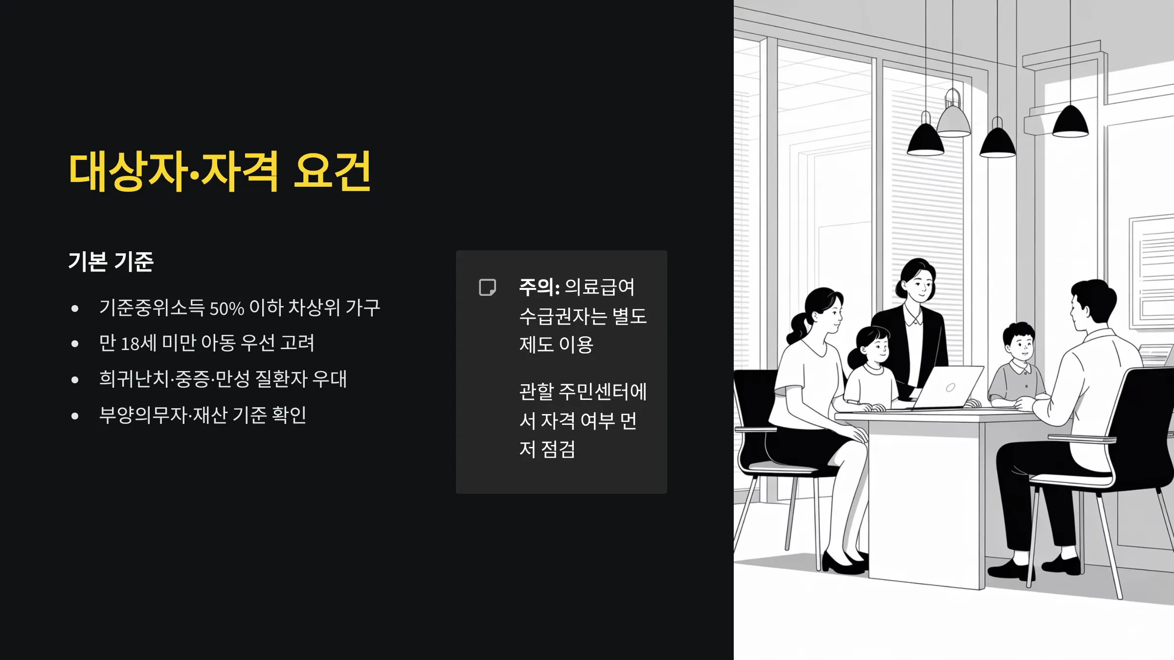 일반적으로 기준중위소득 50% 이하의 차상위 가구가 ‘차상위 본인부담 경감’ 심사 대상이 됩니다. 가구 내 만 18세 미만 아동, 희귀난치·중증·만성 질환자의 존재는 우선 고려 요소이며, 부양의무자·재산 기준도 함께 확인됩니다.