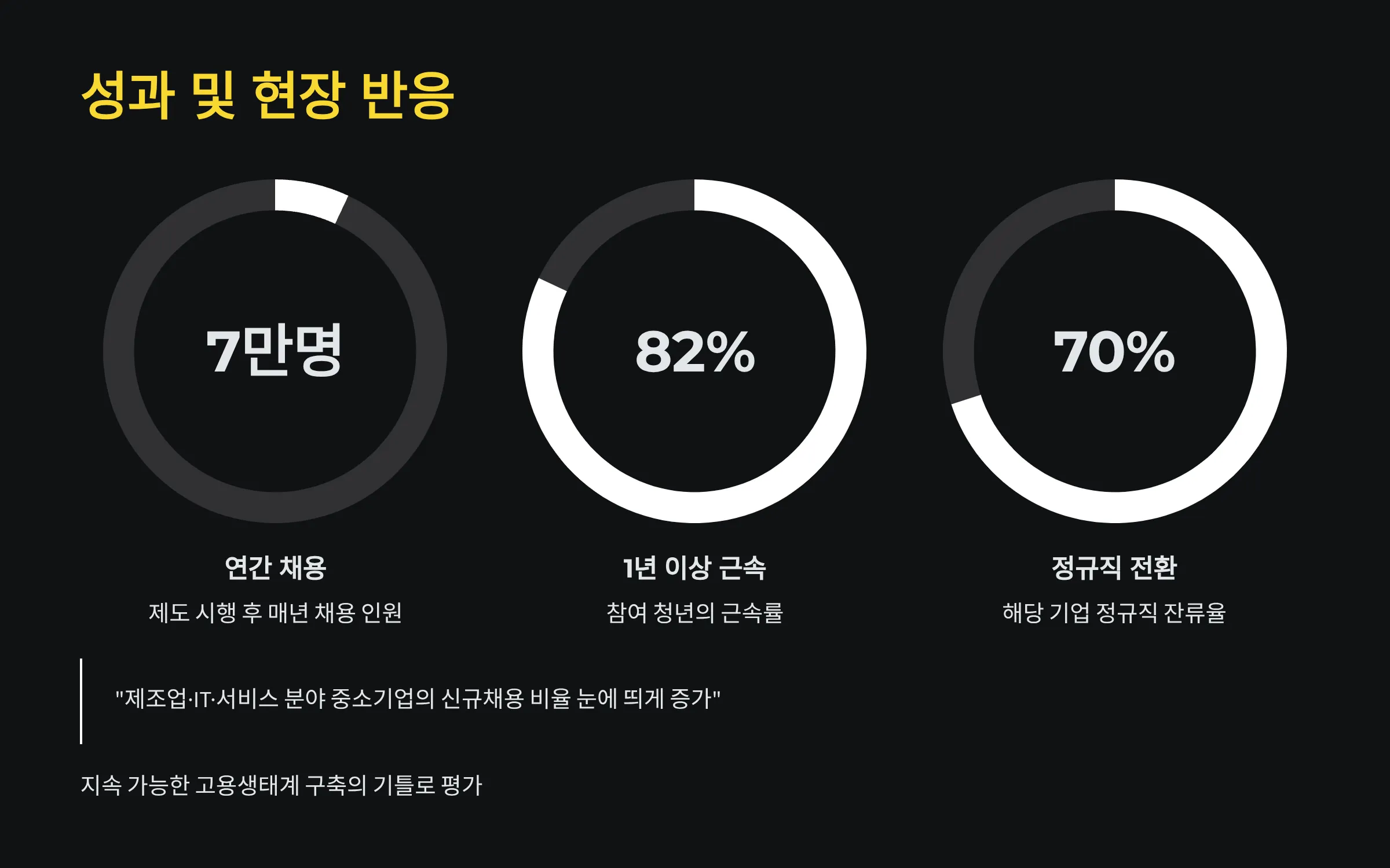 제도 시행 이후 청년 일자리 도약 장려금을 통해 채용된 청년은 매년 7만 명 이상이며, 특히 제조업·IT·서비스 분야 중소기업의 신규채용 비율이 눈에 띄게 높아졌습니다. 기업은 인건비 부담이 줄면서 청년 정규직 전환을 적극적으로 검토하게 되었고, 청년들은 초기 적응 기간 동안 안정적인 급여를 보장받아 근속 의지가 강화되었습니다. 2025년 조사 결과에 따르면, 참여 청년의 82%가 1년 이상 근속했으며, 10명 중 7명은 해당 기업에 정규직으로 남았습니다. 이러한 성과는 단순한 일자리 제공을 넘어 ‘지속 가능한 고용생태계’를 만들어가는 기틀로 평가받고 있습니다.