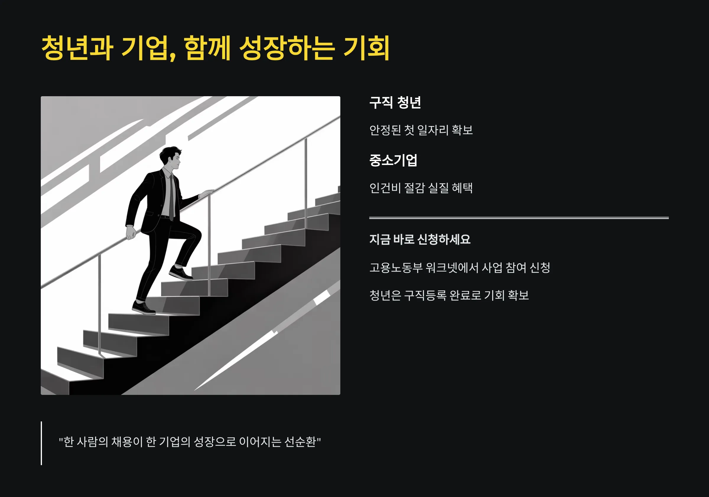 청년 일자리 도약 장려금은 청년과 기업이 함께 성장하는 기반 제도입니다. 구직 청년에게는 안정된 첫 일자리를, 중소기업에는 인건비 절감이라는 실질적 혜택을 제공합니다. 청년 채용을 고민하는 기업이라면 지금 바로 고용노동부 워크넷에서 사업 참여를 신청하고, 청년 본인은 구직등록을 완료해 기회를 잡으세요. 한 사람의 채용이 한 기업의 성장으로 이어지는 선순환의 시작, 그것이 바로 청년 일자리 도약 장려금의 진짜 의미입니다.