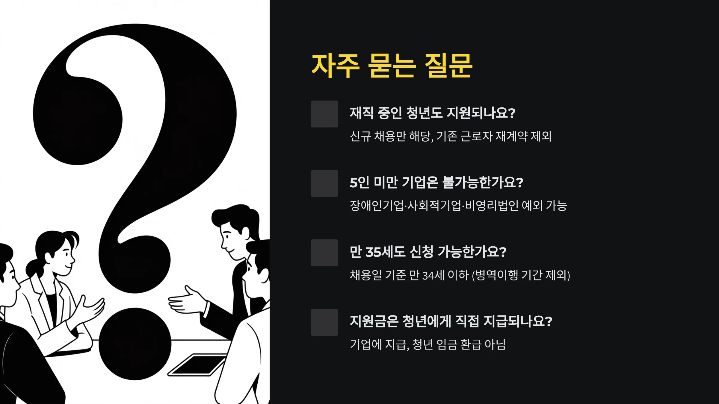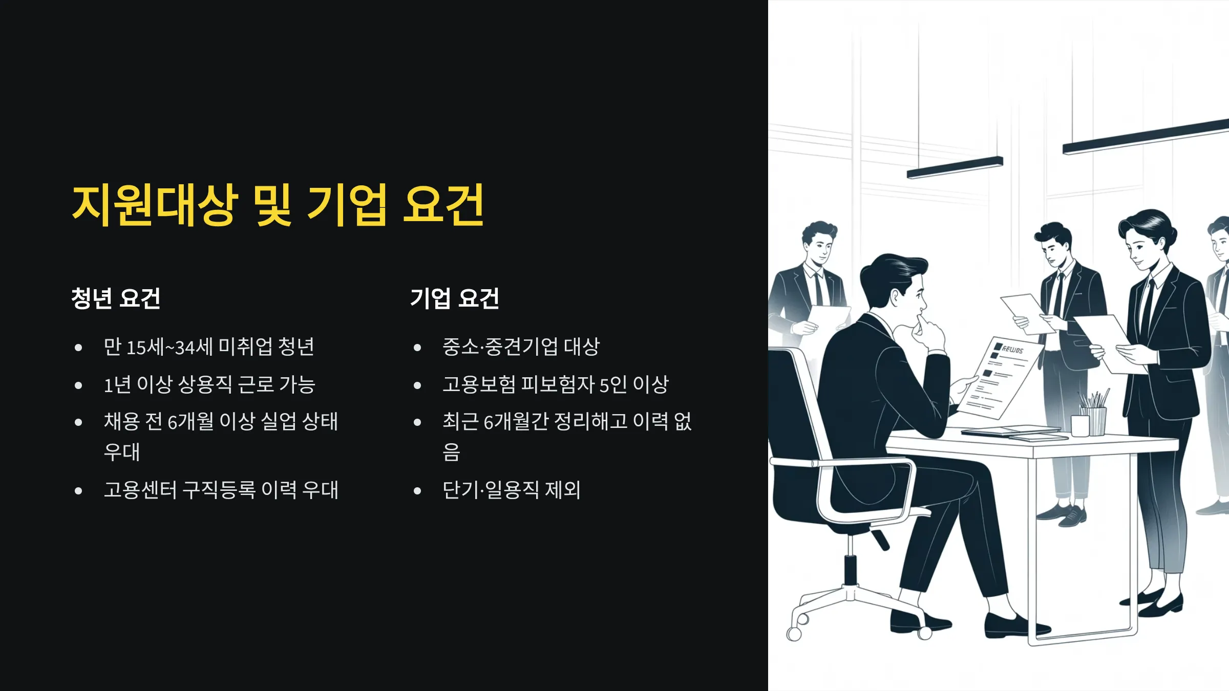 기업은 고용보험 피보험자 수가 5인 이상(일부 예외 업종 1인 이상)이어야 하며, 최근 6개월간 정리해고·휴업 조치 이력이 없어야 합니다. 청년은 채용 전 6개월 이상 실업 상태이거나, 고용센터 구직등록 이력이 있는 경우 우선 지원됩니다.