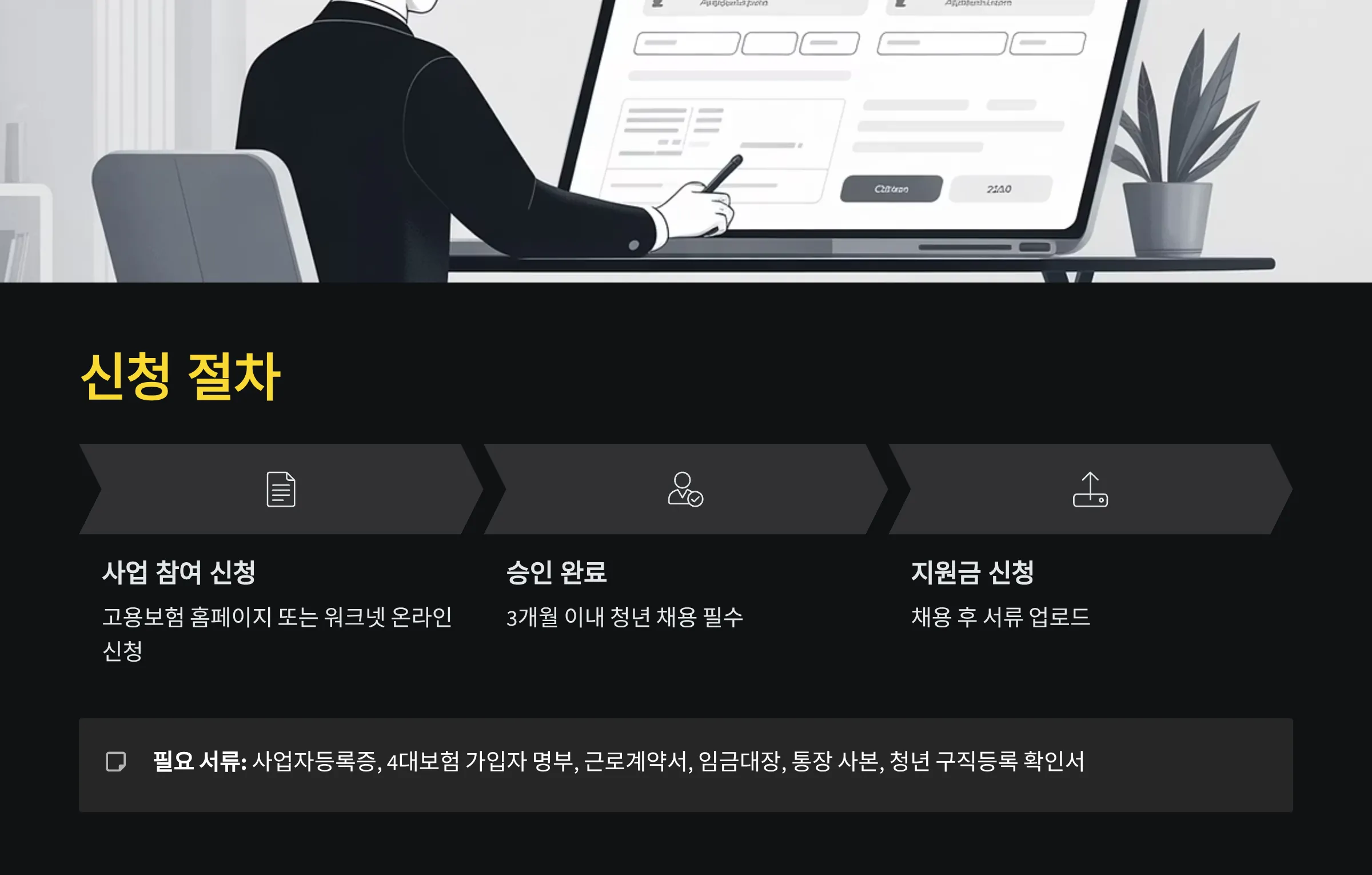신청은 고용노동부 고용보험 홈페이지 또는 워크넷을 통해 온라인으로 가능합니다. 기업이 먼저 사업 참여 신청서를 제출하고, 승인이 완료되면 청년 채용 후 지원금 신청서를 업로드하는 방식입니다.