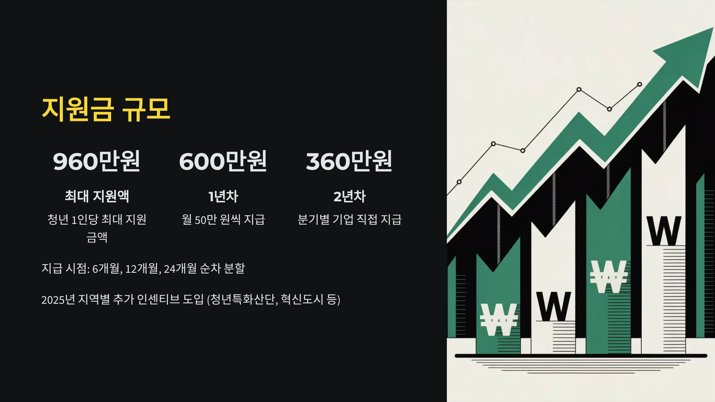 청년이 6개월 이상 근속하면 1차 지급이 시작되고, 12개월, 24개월 시점별로 순차 분할 지급됩니다. 2025년부터는 지역별 추가 인센티브(예: 청년특화산단, 혁신도시 등)도 도입되어 동일 기업이라도 지역 여건에 따라 청년 일자리 도약 장려금 금액이 상향될 수 있습니다.