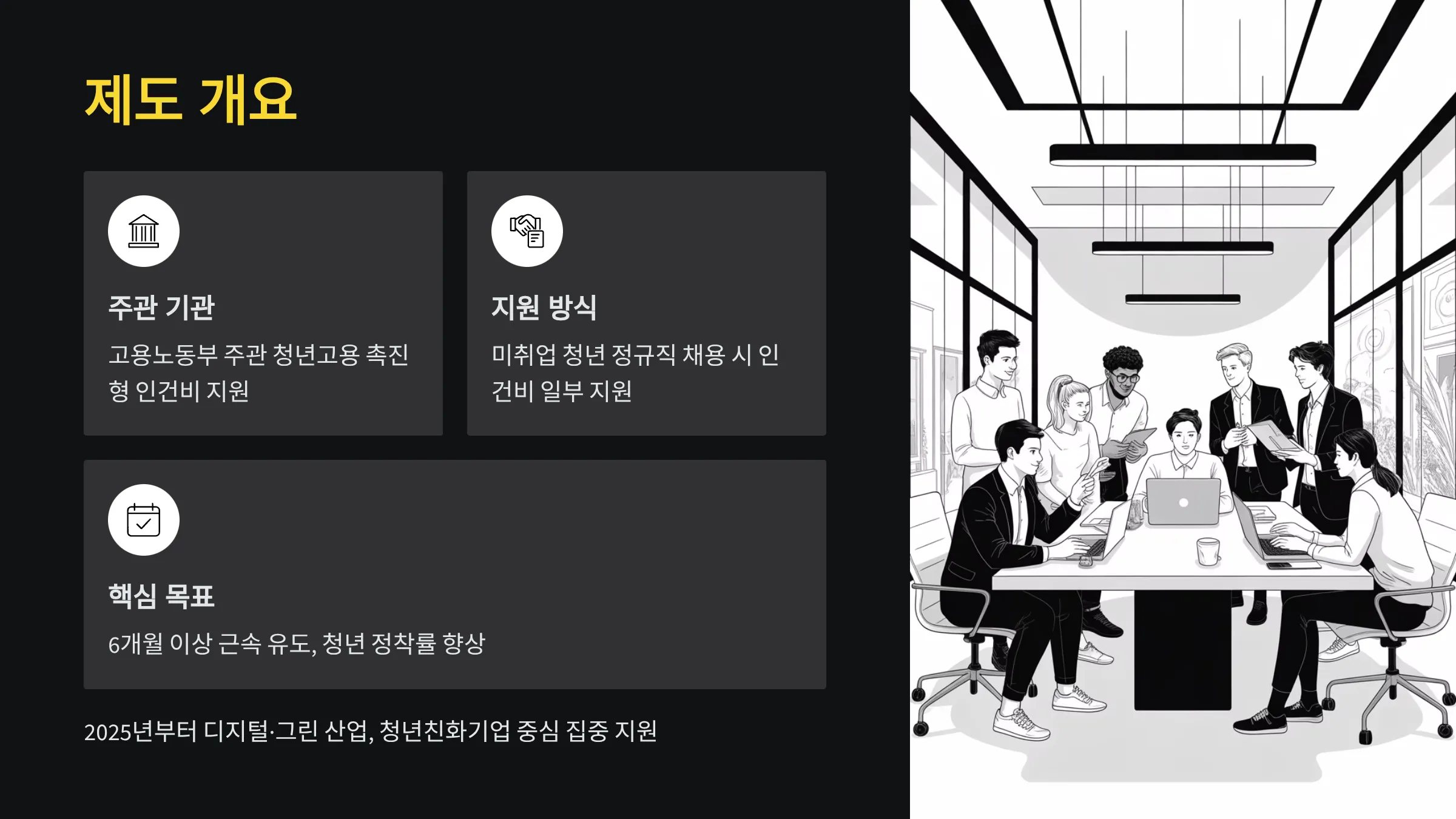 단순 채용보조금이 아닌, 6개월 이상 근속을 유도하며 청년 정착률을 높이는 실질적 프로그램으로 운영됩니다. 특히 2025년부터는 디지털·그린 산업, 청년친화기업 등 우대산업 중심으로 청년 일자리 도약 장려금이 집중 지원되고 있습니다.