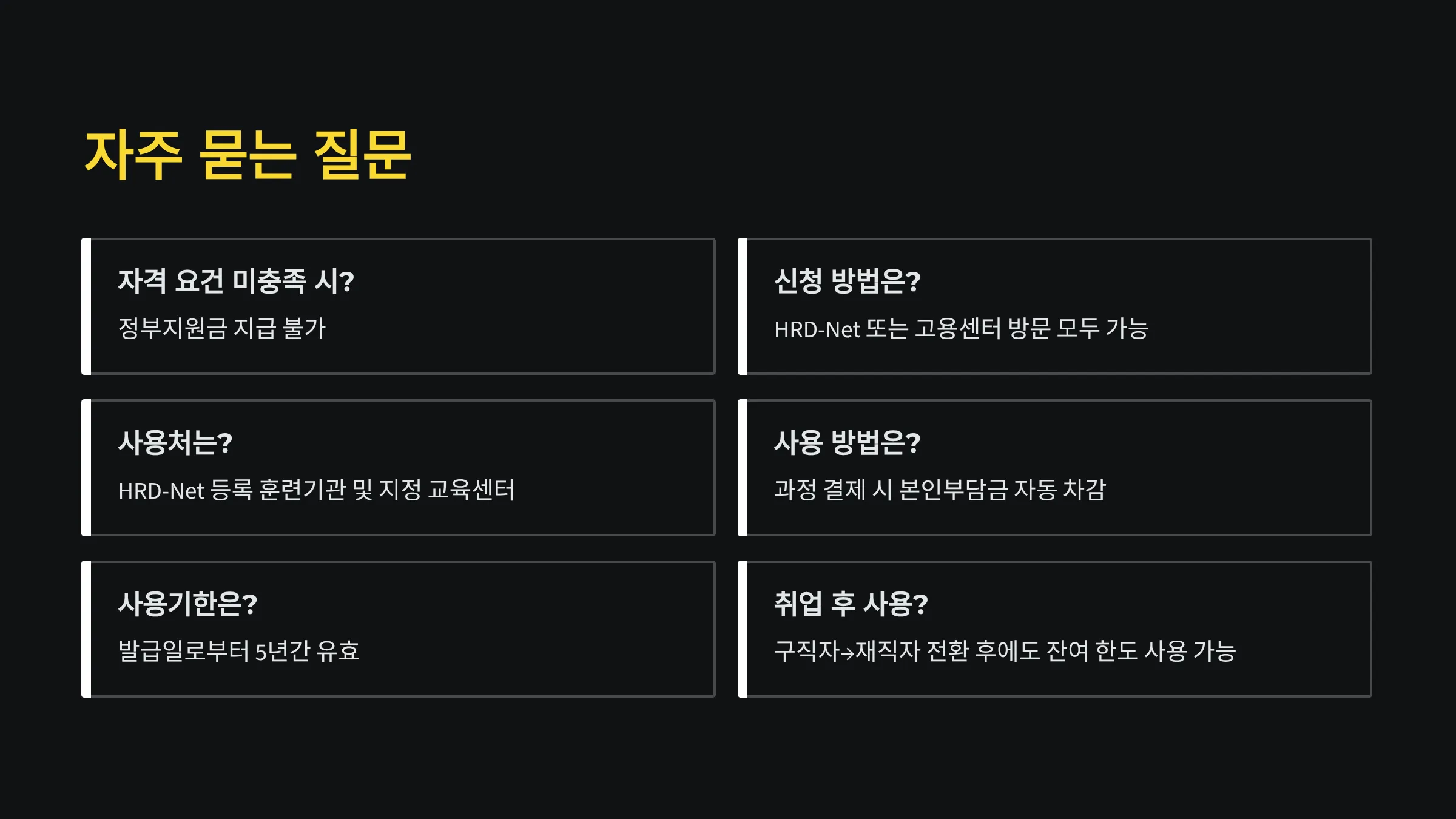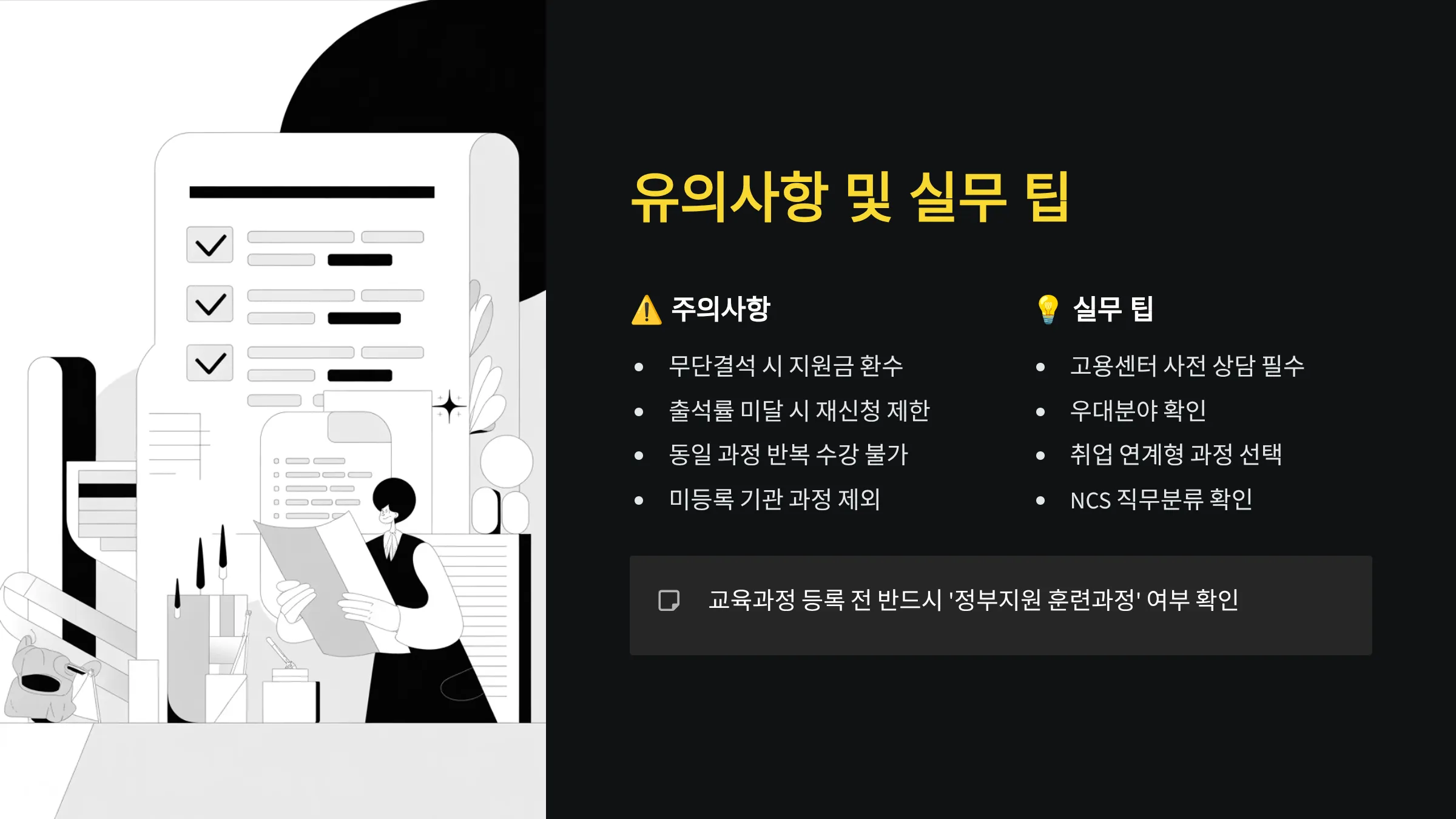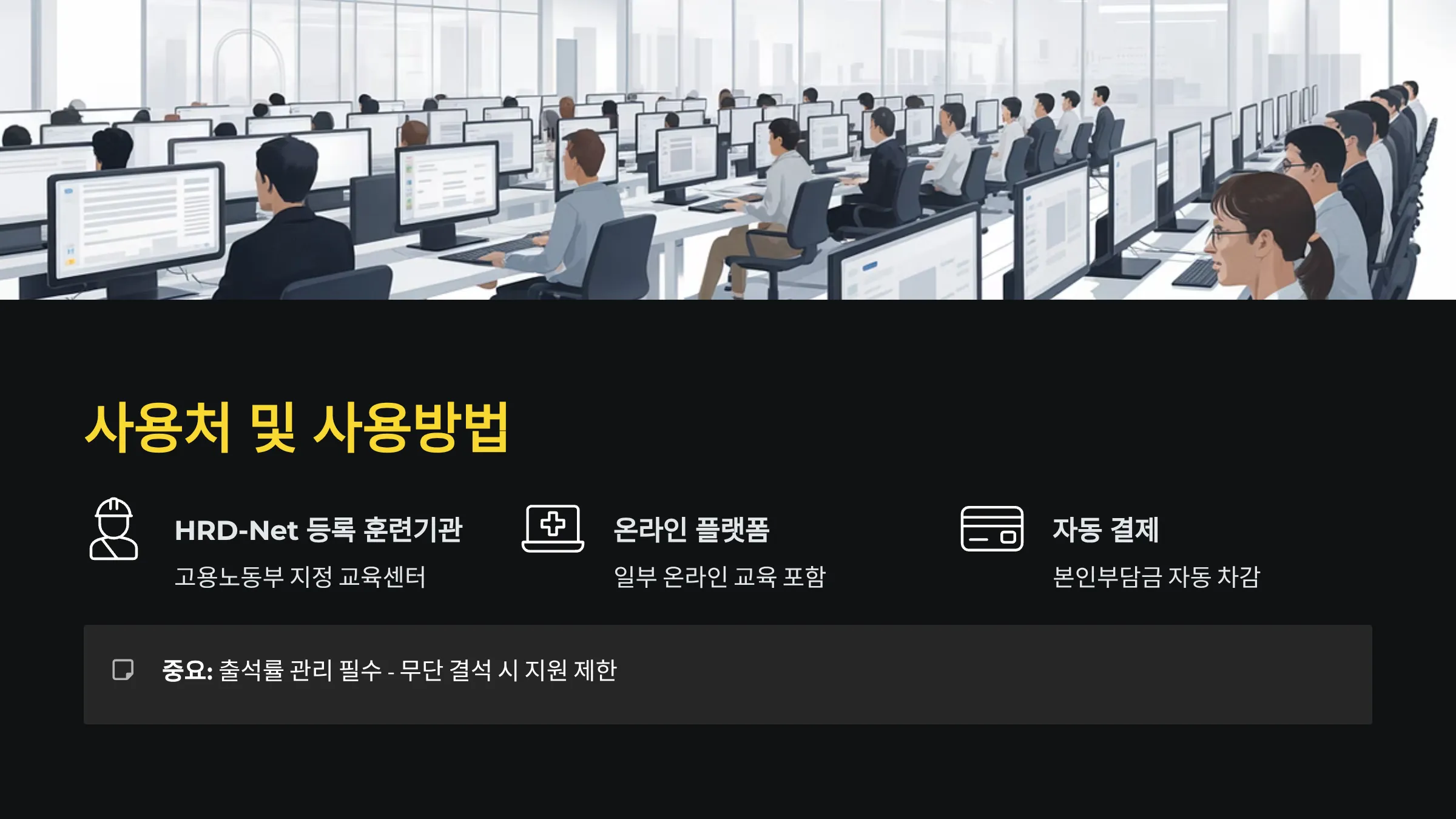 정부는 교육기관에 훈련비를 직접 지급하기 때문에, 수강생은 비용 부담 없이 실질적인 역량개발에 집중할 수 있습니다. 단, 동일 과정 반복 수강이나 무단 결석이 잦으면 지원이 제한될 수 있으니 출석률 관리가 필수입니다.
