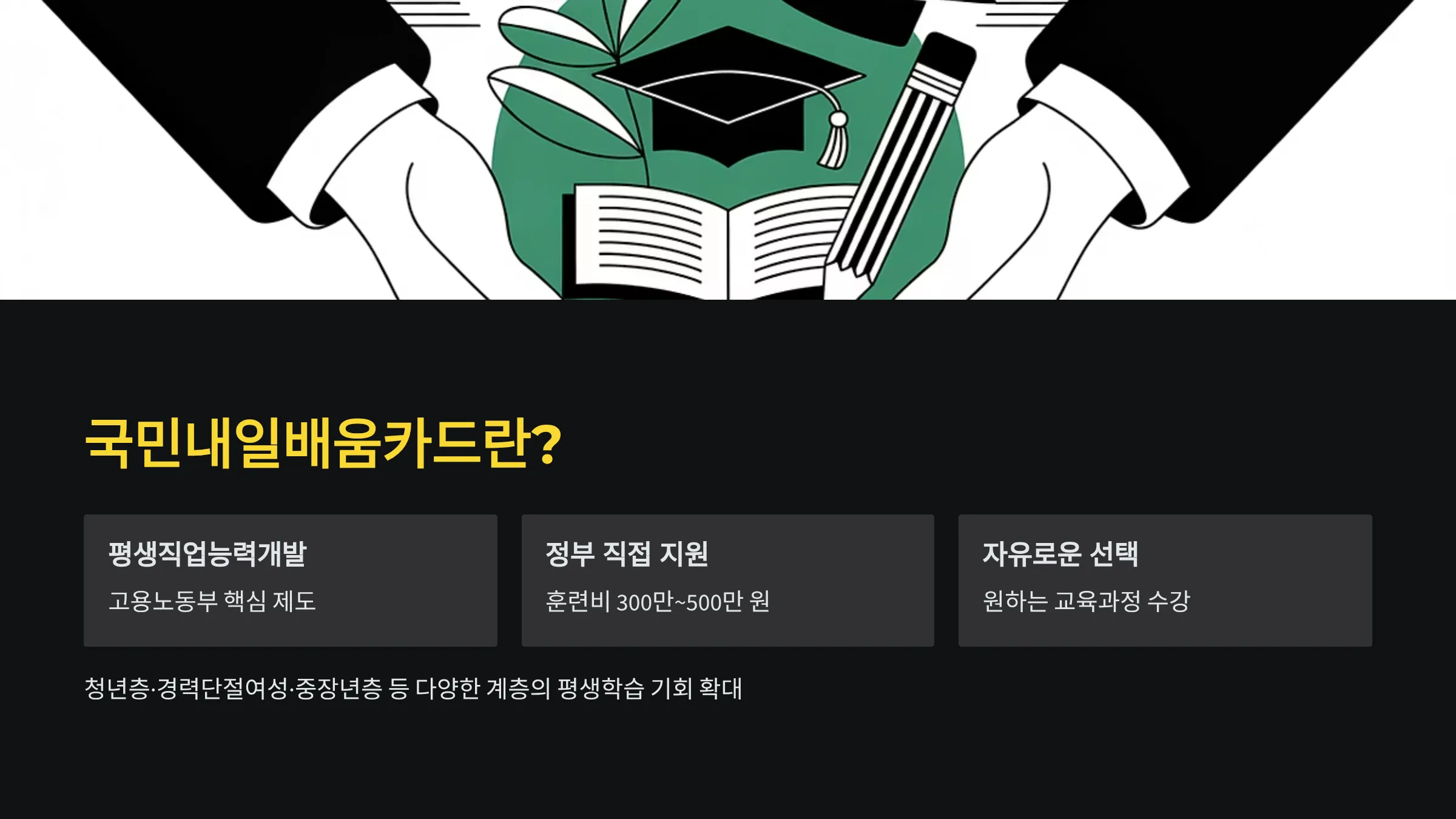 카드 발급자는 1인당 300만~500만 원까지 한도 내에서 자유롭게 교육을 선택할 수 있으며, 일부 취약계층은 추가 금액이 지급됩니다. 이 제도는 특히 청년층·경력단절여성·중장년층 등 다양한 계층의 ‘평생학습 기회’를 확대하는데 목적이 있습니다.