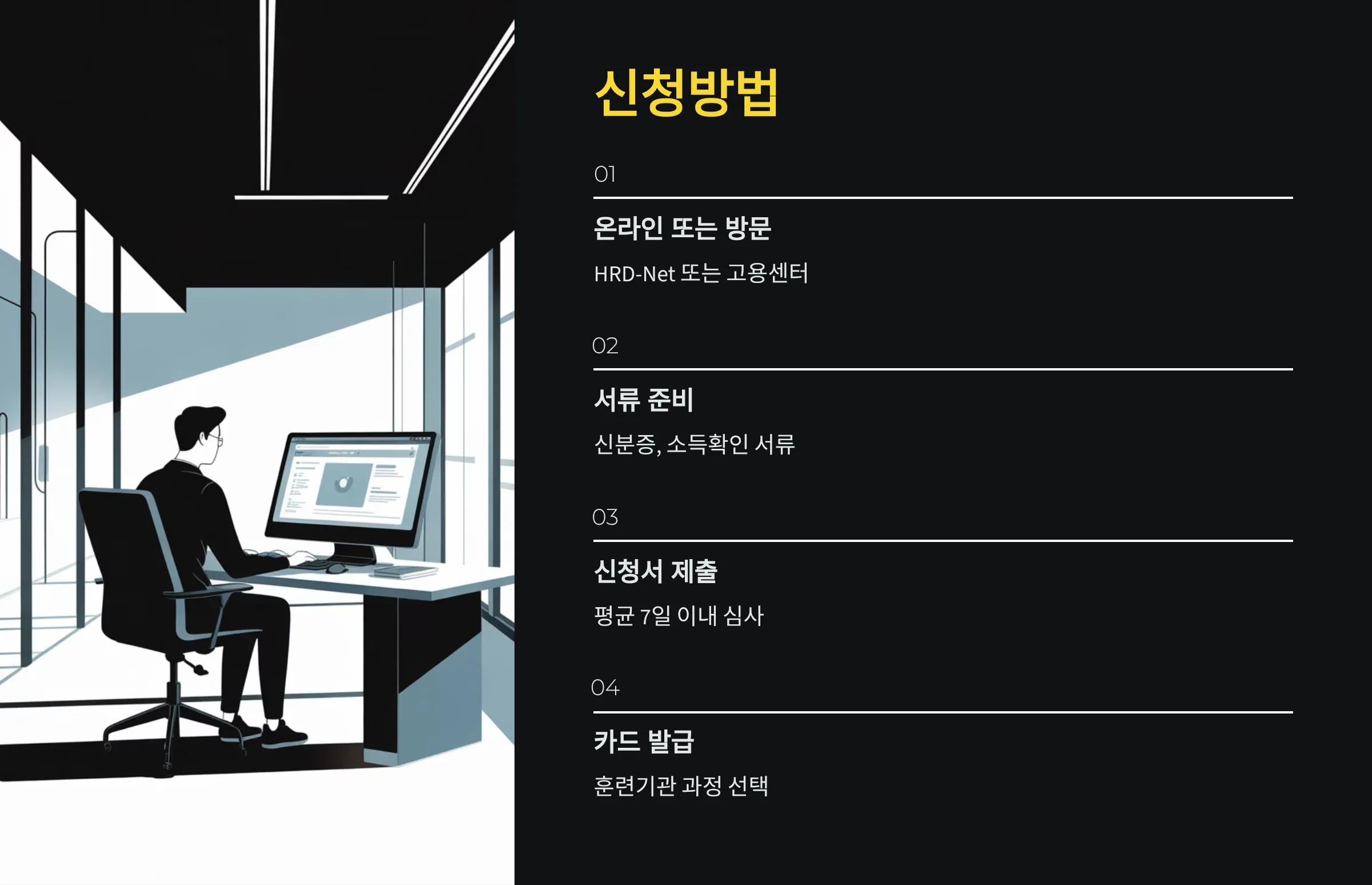 국민내일배움카드 신청방법은 HRD-Net(직업훈련포털)에서 온라인으로 진행하거나, 가까운 고용센터에서 직접 신청할 수 있습니다. 본인 명의의 신분증과 소득확인 서류를 준비해 신청서를 제출하면, 평균 7일 이내 심사를 거쳐 카드가 발급됩니다.
