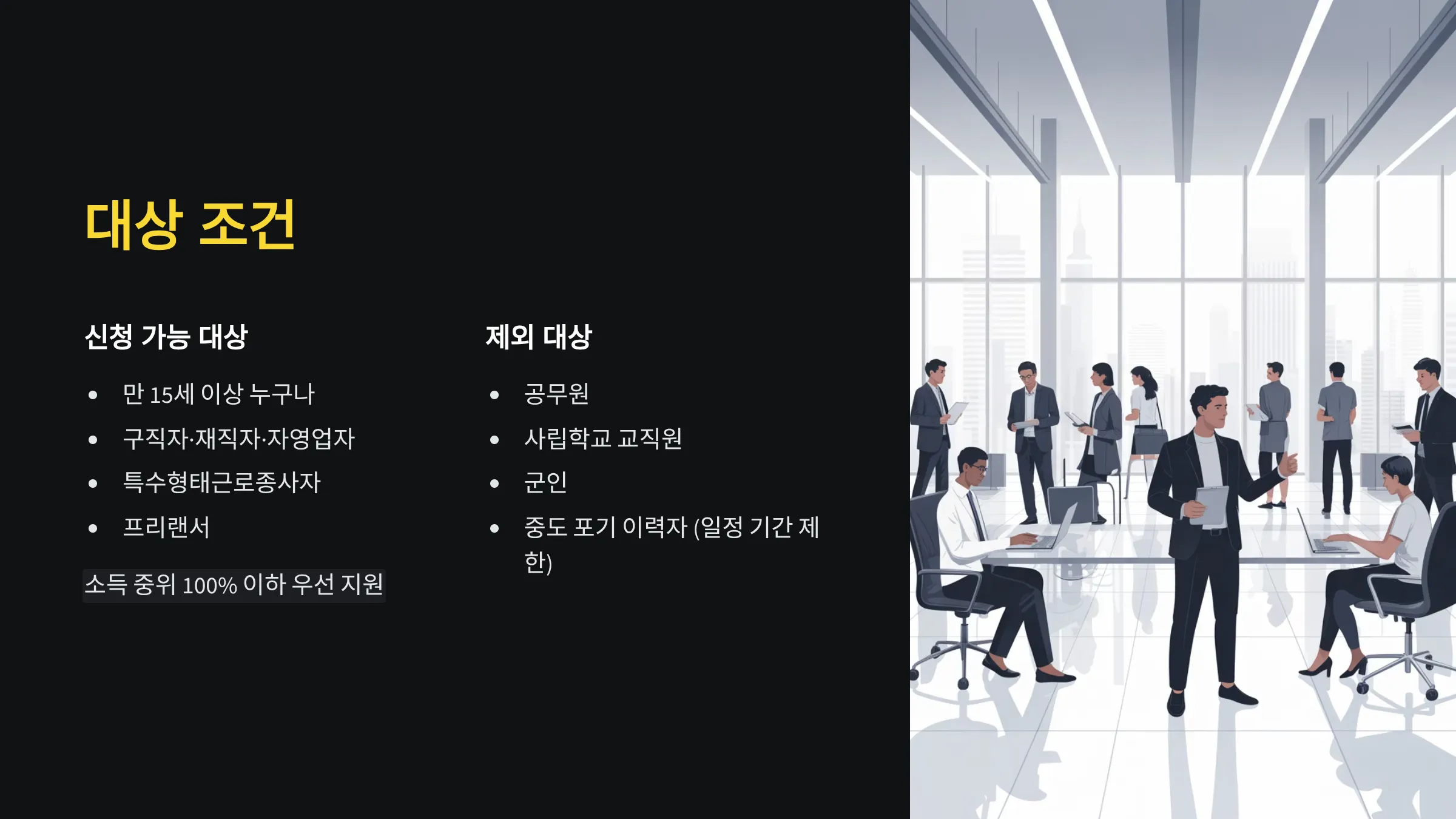 공무원, 사립학교 교직원, 군인 등은 제외되며, 과거 정부지원 훈련 중도 포기 이력이 있는 경우 일정 기간 제한을 받을 수 있습니다.