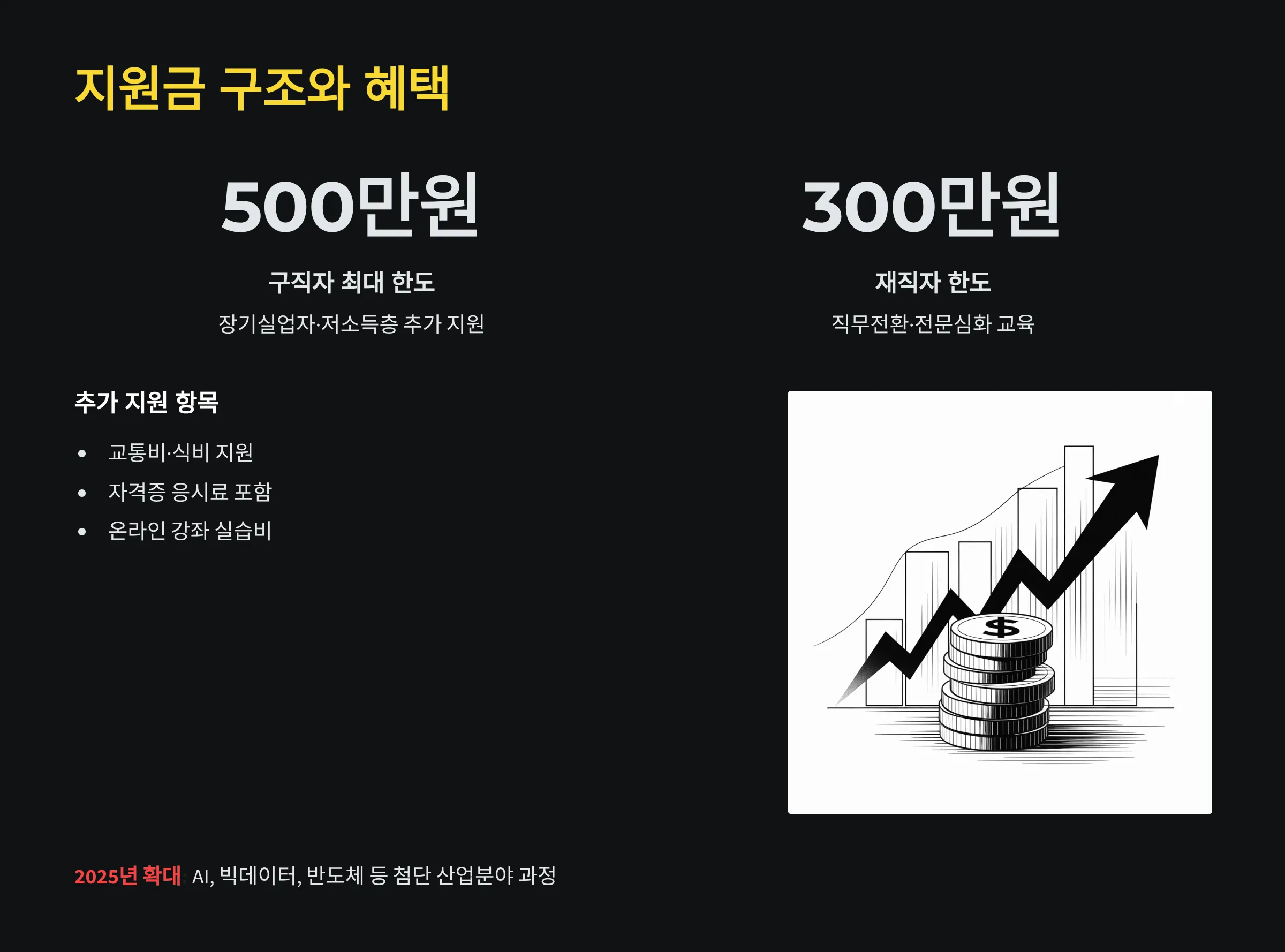 국민내일배움카드의 가장 큰 장점은 정부가 훈련비를 직접 지원한다는 점입니다. 구직자는 최대 500만 원, 재직자는 300만 원 한도 내에서 수강할 수 있으며, 장기실업자·저소득층은 추가 지원이 가능합니다. 일부 과정은 교통비·식비·자격증 응시료까지 포함되며, 온라인 강좌의 경우 실습비까지 포함된 사례도 많습니다. 특히 2025년부터는 AI, 빅데이터, 반도체 등 첨단 산업분야 과정이 확대되어 지원폭이 더욱 넓어졌습니다.