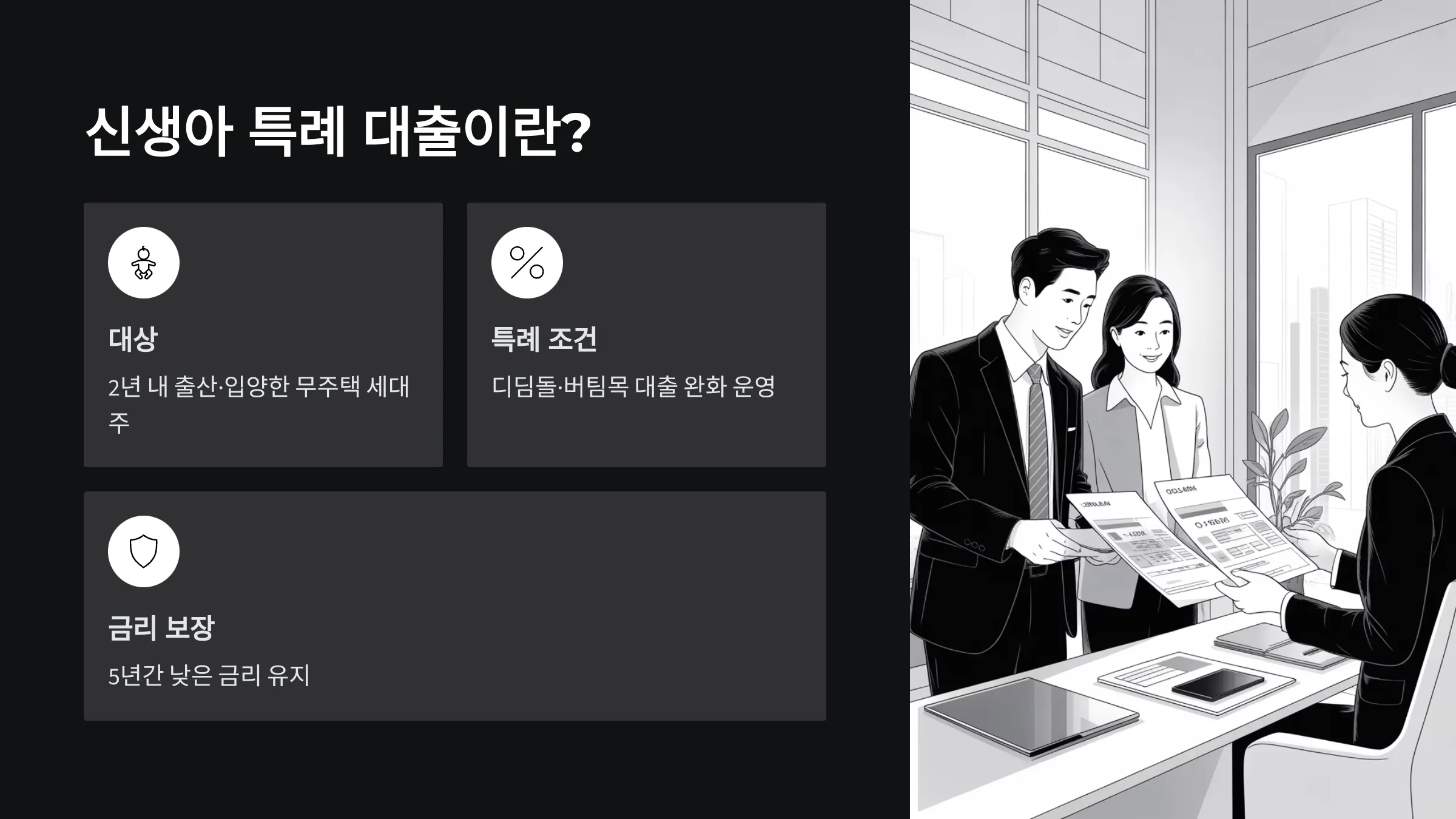 신생아 특례 대출은 주택도시기금의 정책상품을 신생아 가정에 맞춰 특례로 적용하는 제도입니다. 출산 또는 입양 후 2년 이내에 해당하는 무주택 세대주가 대상이며, 실거주 목적으로 집을 사거나 전세로 이주할 때 적용됩니다.