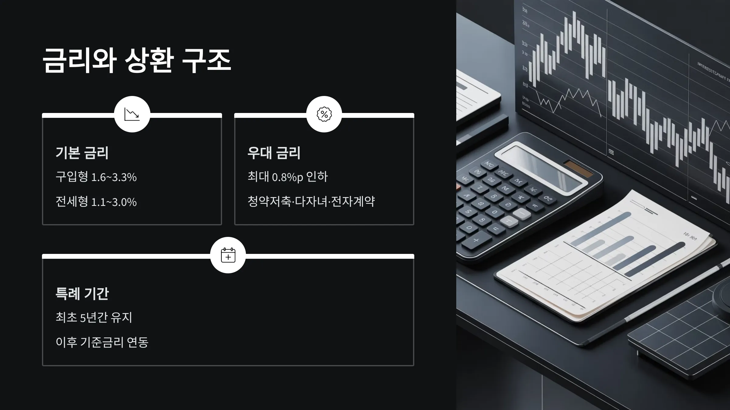 | 기간/상환 | 10~30년, 원리금·체증식 | 2~12년, 원리금균등 |