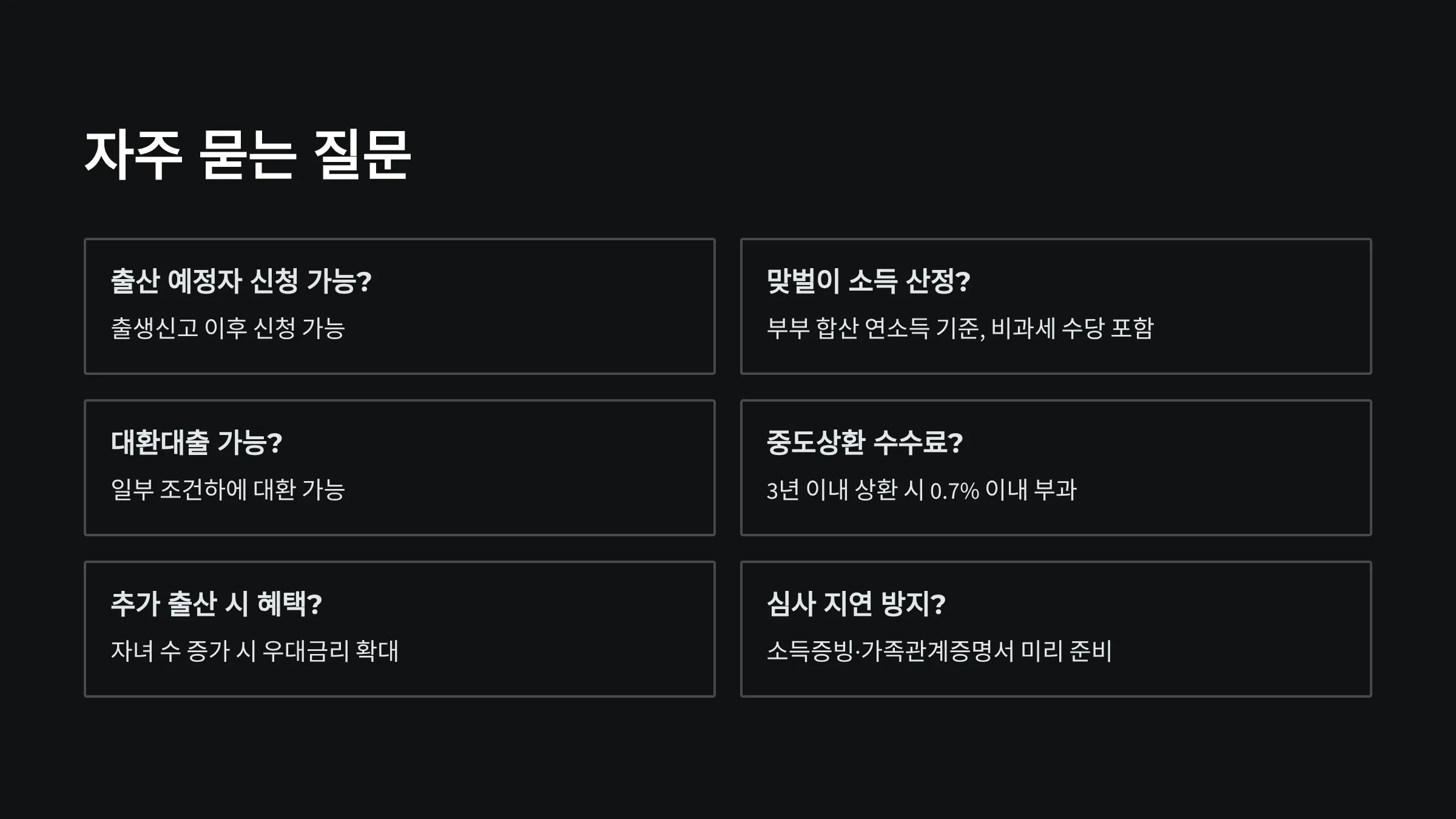 신생아 특례 대출은 단기 유동성 확보와 장기 주거 안정이라는 두 가지 목표를 동시에 만족시킬 수 있는 정책 금융입니다. 신청 전 가구 소득·자산·계약 일정을 정리해 한도와 금리 우대를 최대한 확보하고, 변동 전환 시점의 대환 가능성까지 미리 계획해 두면 리스크를 줄일 수 있습니다. 오늘 안내한 조건·금리·절차·지역 한도와 Q&A를 기준으로 체크리스트를 만들어 진행하면, 신생아 특례 대출을 보다 체계적으로 활용할 수 있습니다.
