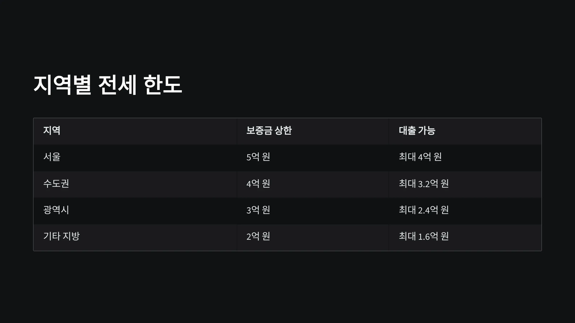 | 서울 | 5억 원 | 최대 4억 원(80%) |