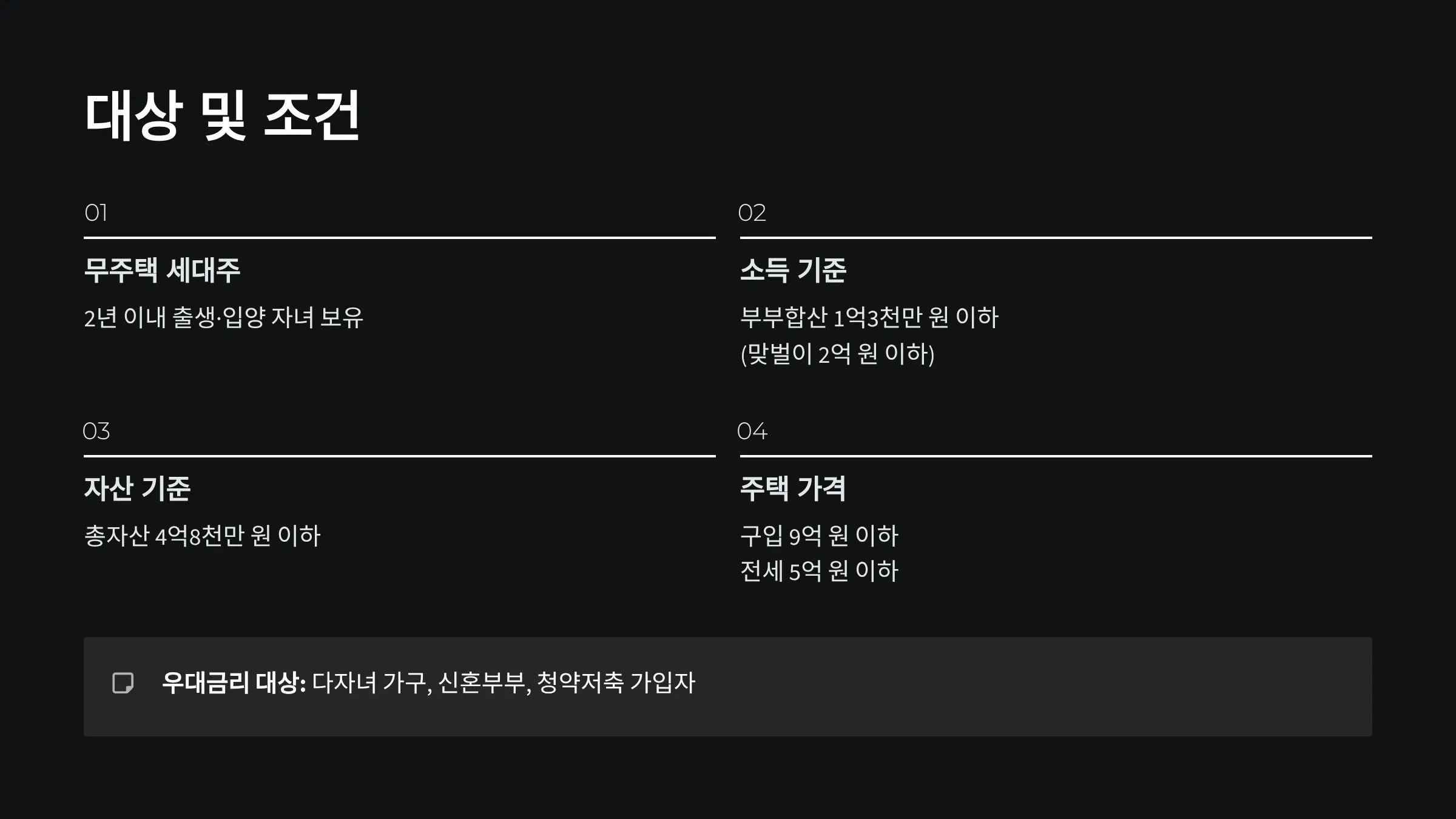 신생아 특례 대출 대상은 무주택 세대주이고, 신청일 기준 최근 2년 이내 출산 또는 입양 사실이 있어야 합니다. 일반적으로 부부합산 연소득 1억3천만 원 이하(맞벌이 일부 완화), 총자산 4억대 후반 이하가 적용되며, 구입형은 주택가격 9억 원 이하가 원칙입니다.