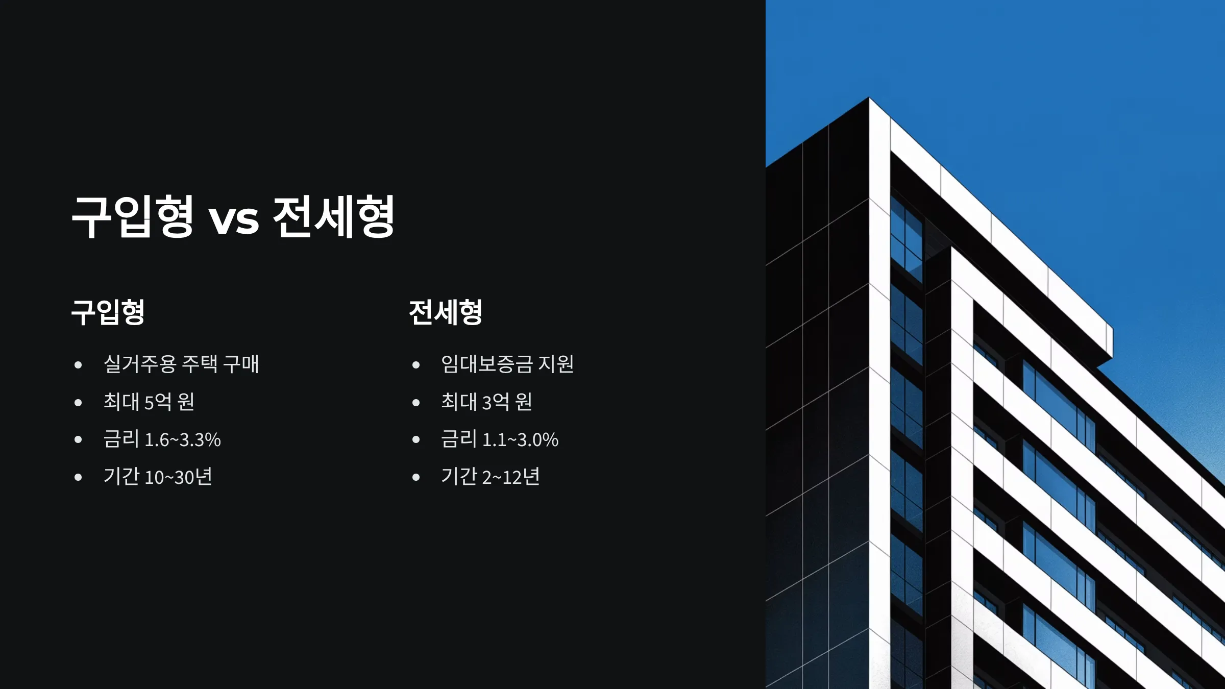 장기 거주·내 집 마련이 목표면 구입형이, 이사·육아 준비로 유동성이 중요하면 전세형이 유리합니다. 신생아 특례 대출의 우대금리는 두 유형 모두 적용되므로 가구의 현금흐름·계약 일정에 맞춰 선택하세요.