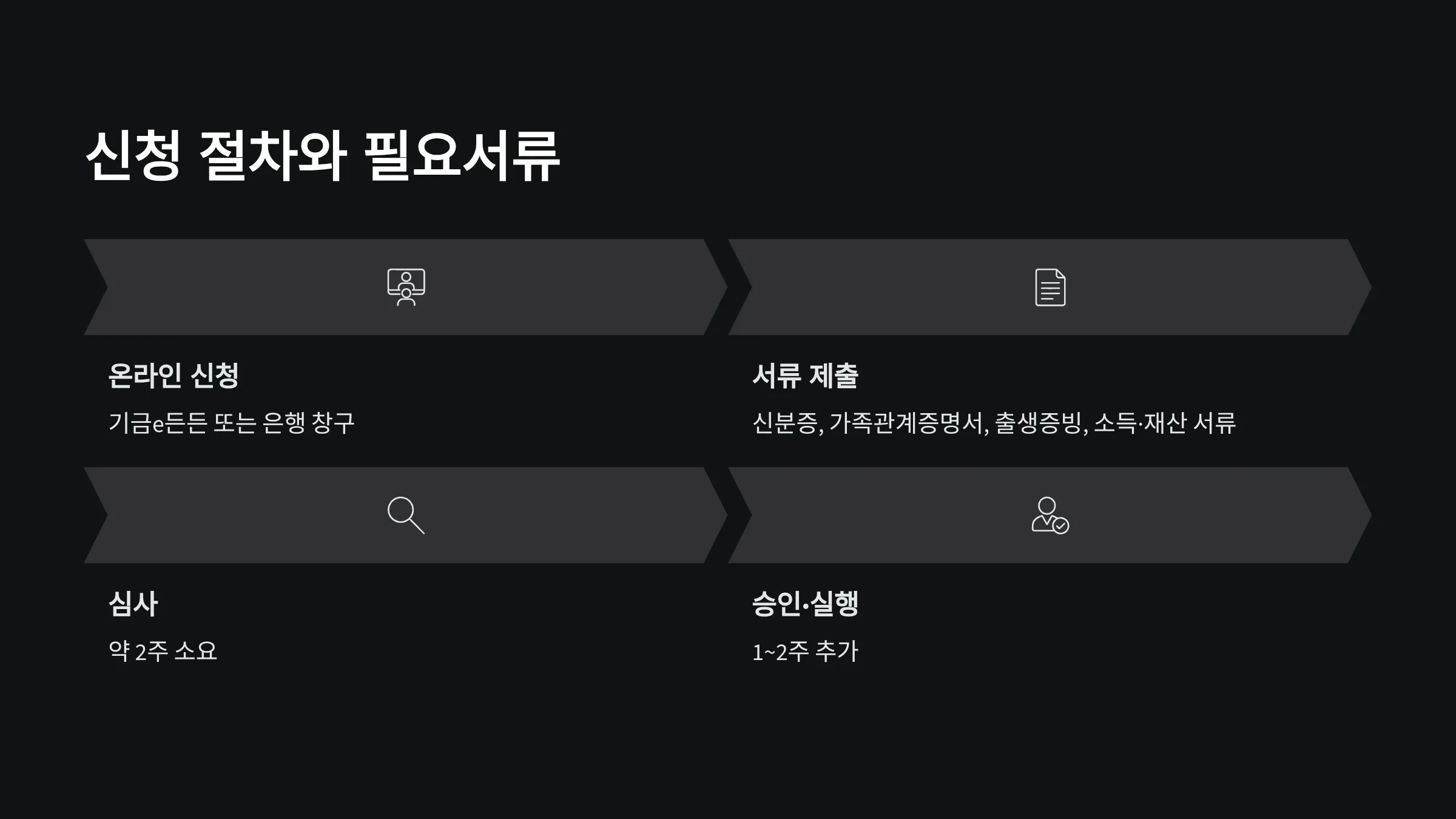 기본 서류는 신분증, 가족관계증명서, 출생(입양) 증명, 소득금액증명·재직증명, 주택매매(또는 전세) 계약서, 목적물 등기·전입 계획 등입니다. 평균 심사 기간은 2주 내외지만, 성수기에는 더 길어질 수 있으니 계약일 역산 일정으로 여유 있게 신청하는 것이 안전합니다.