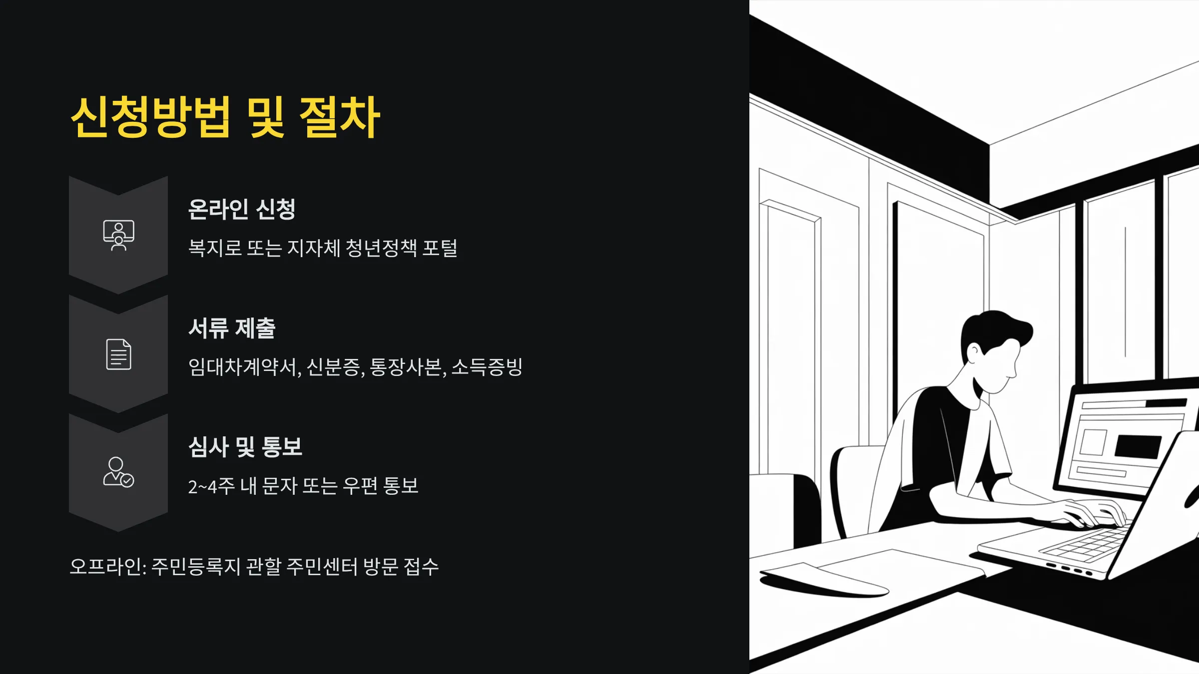 온라인 신청은 복지로(bokjiro.go.kr) 또는 각 지자체 청년정책 포털에서 가능하며, 오프라인은 주민등록지 관할 주민센터에서 접수할 수 있습니다.