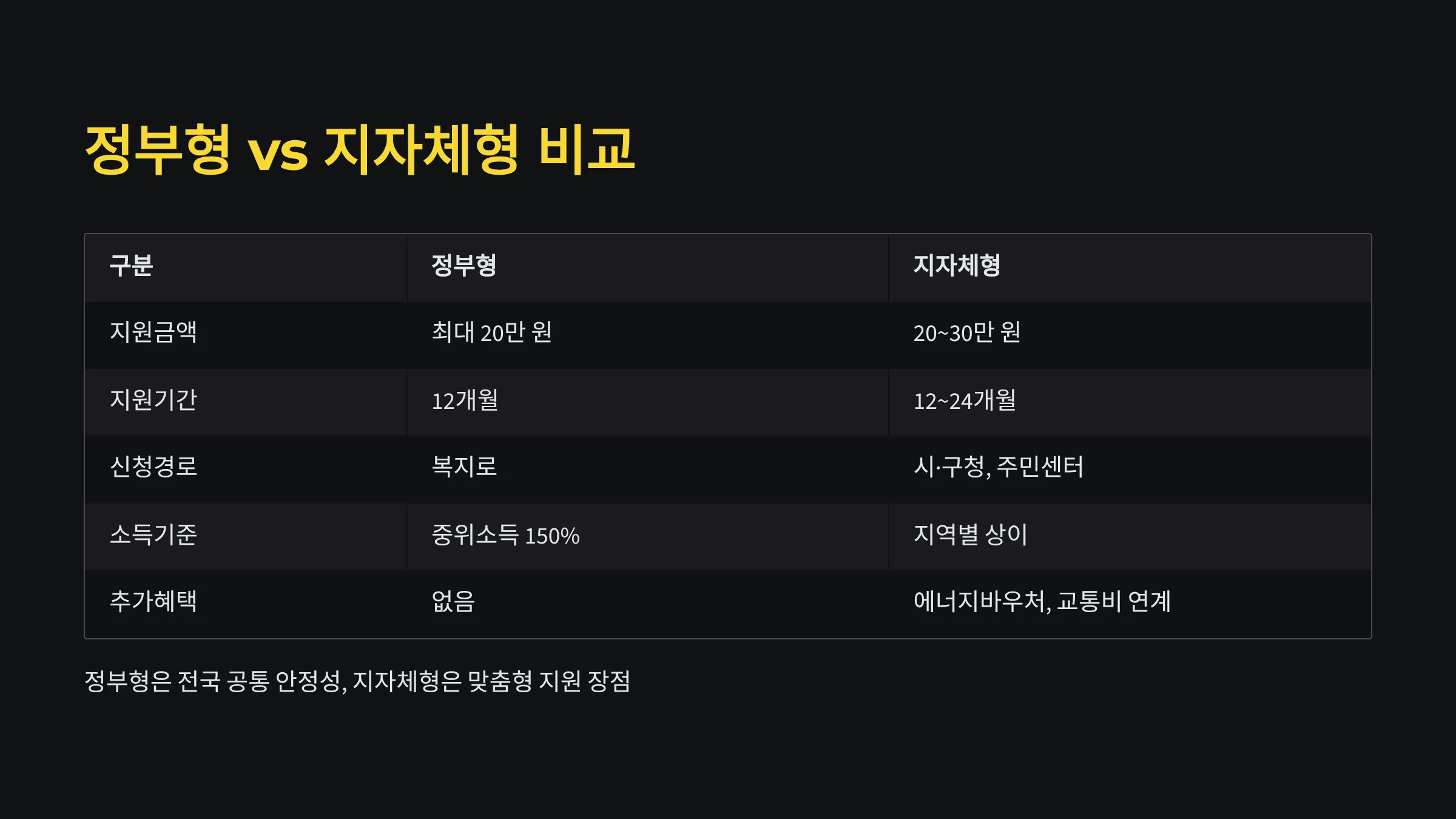 정부형은 전국 공통기준으로 안정적이며, 지자체형은 지역 실정에 맞춘 맞춤형 지원이 장점입니다.