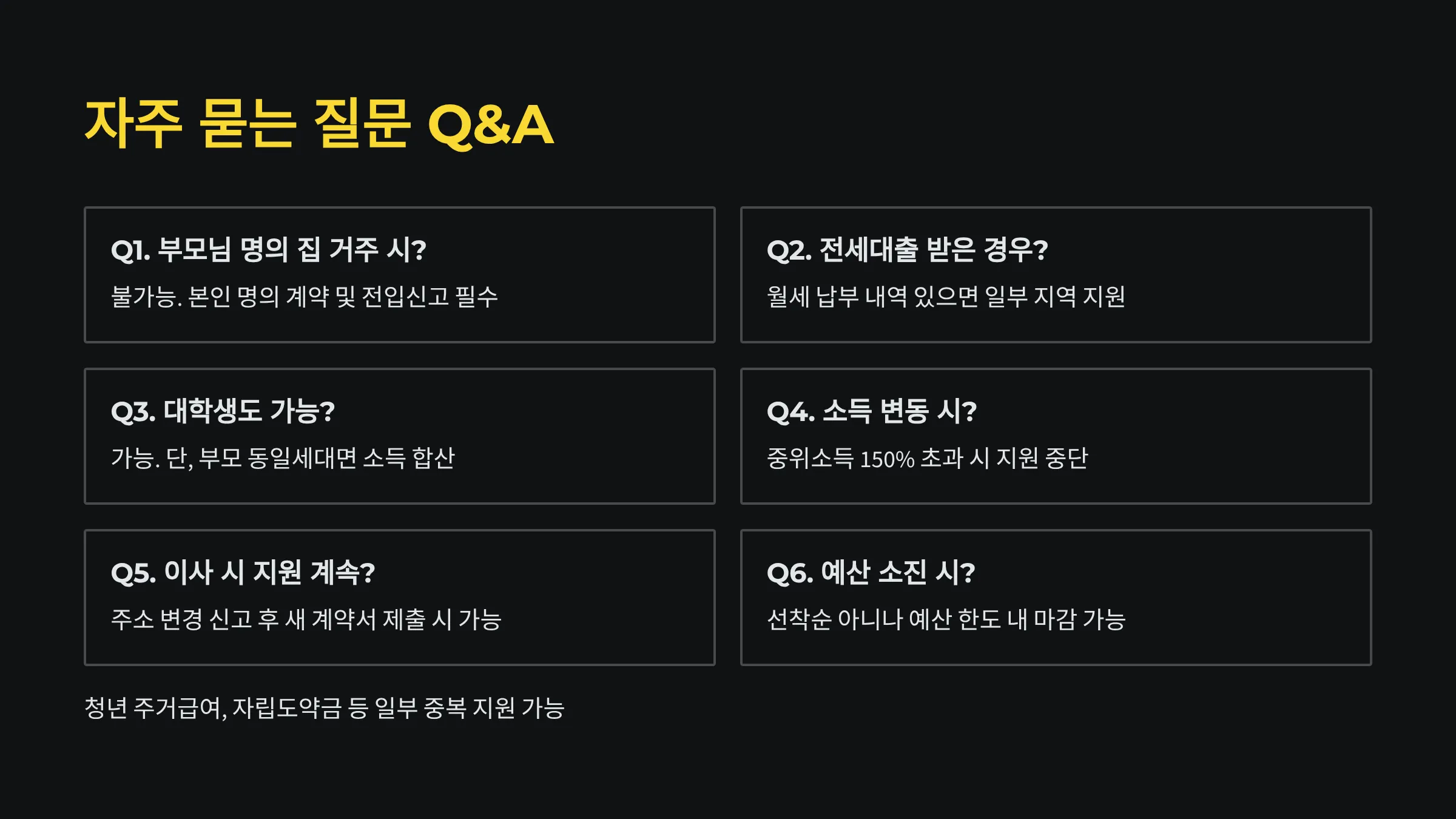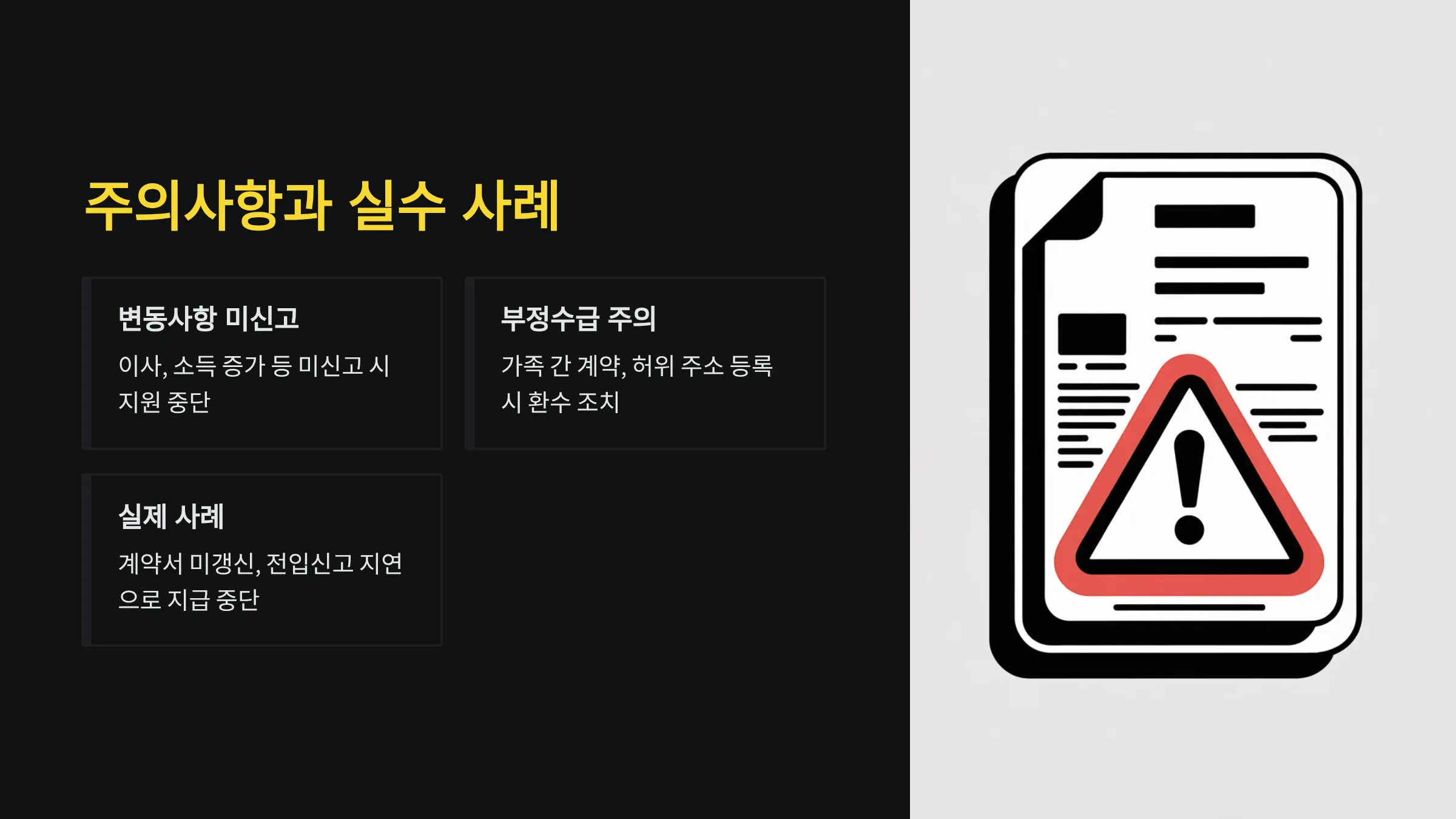 임대차계약 변경, 이사, 소득 증가 등 변동 사항을 신고하지 않으면 지원이 중단될 수 있습니다. 가족 간 임대차 계약이나 허위 주소 등록은 부정수급으로 간주되어 환수 조치됩니다. 실제로 일부 청년이 계약서를 갱신하지 않거나 전입신고를 늦게 해 지급이 중단된 사례가 있어 주의가 필요합니다.