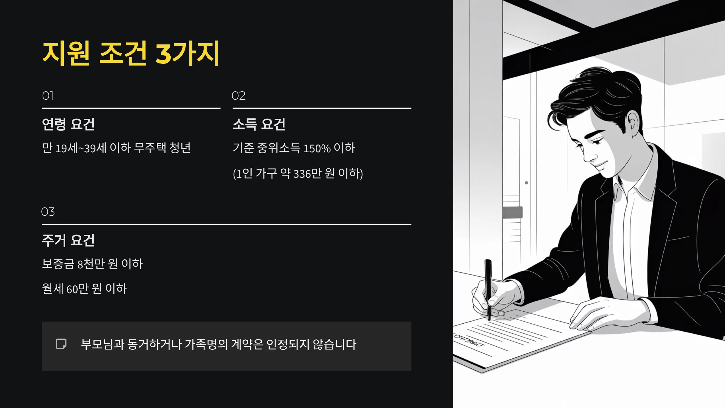③ 주거 요건: 보증금 8천만 원 이하, 월세 60만 원 이하의 주택, 원룸, 고시원, 오피스텔 등. 단, 부모님과 동거하거나 가족명의 계약은 인정되지 않습니다.