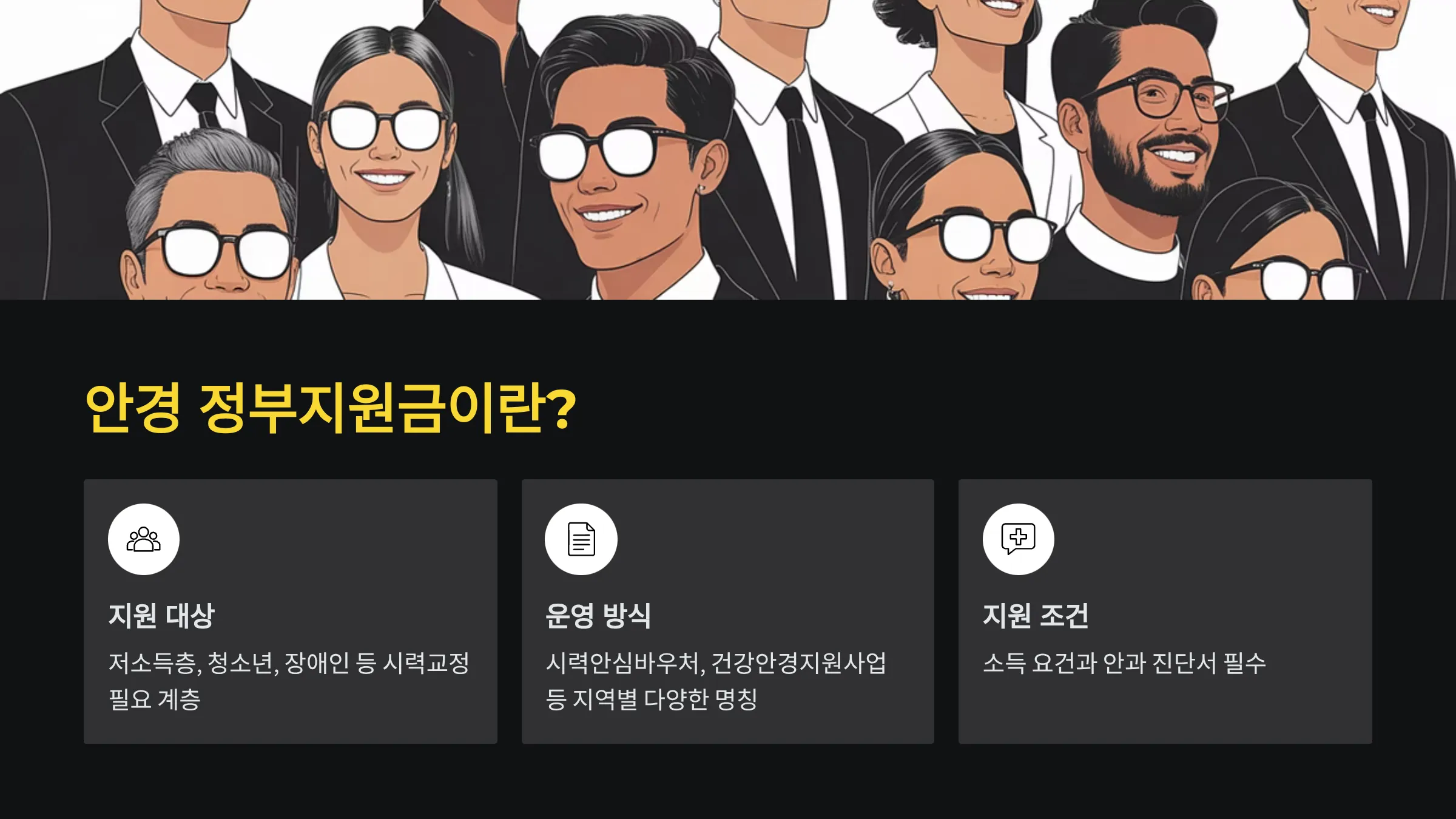 지역별로 ‘시력안심바우처’, ‘건강안경지원사업’ 등 다양한 명칭으로 운영되며, 기본적으로 일정한 소득 요건과 진단서를 갖춘 사람을 대상으로 합니다. 최근에는 학습권 보장과 복지격차 해소 차원에서 안경 정부지원금 혜택이 확대되고 있습니다.