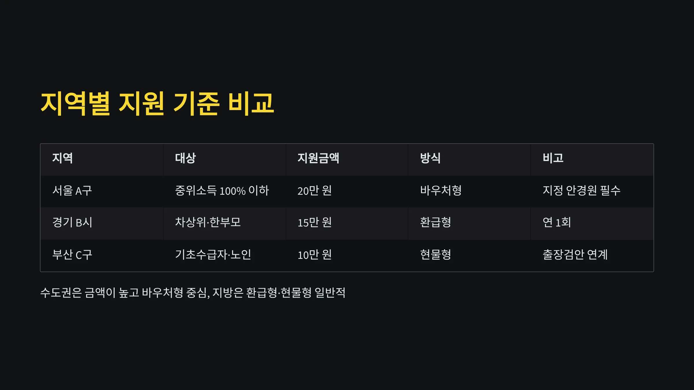수도권은 금액이 높고 바우처형이 많으며, 지방은 환급형이나 현물형이 일반적입니다.