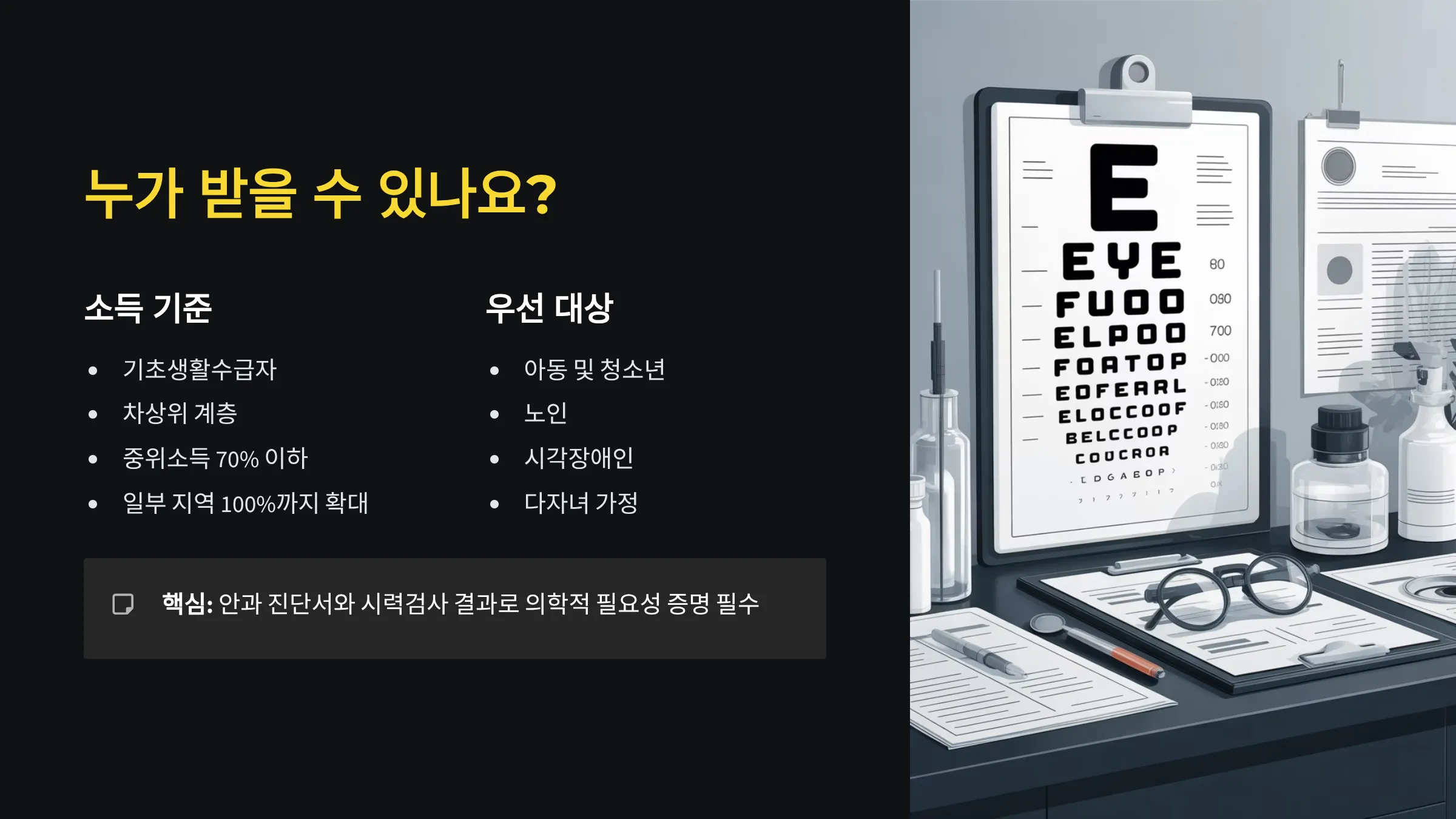 아동, 청소년, 노인, 시각장애인, 다자녀 가정이 우선순위를 갖습니다. 특히 안과 진단서와 시력검사 결과 등 의학적 필요성을 증명하는 서류가 핵심입니다.