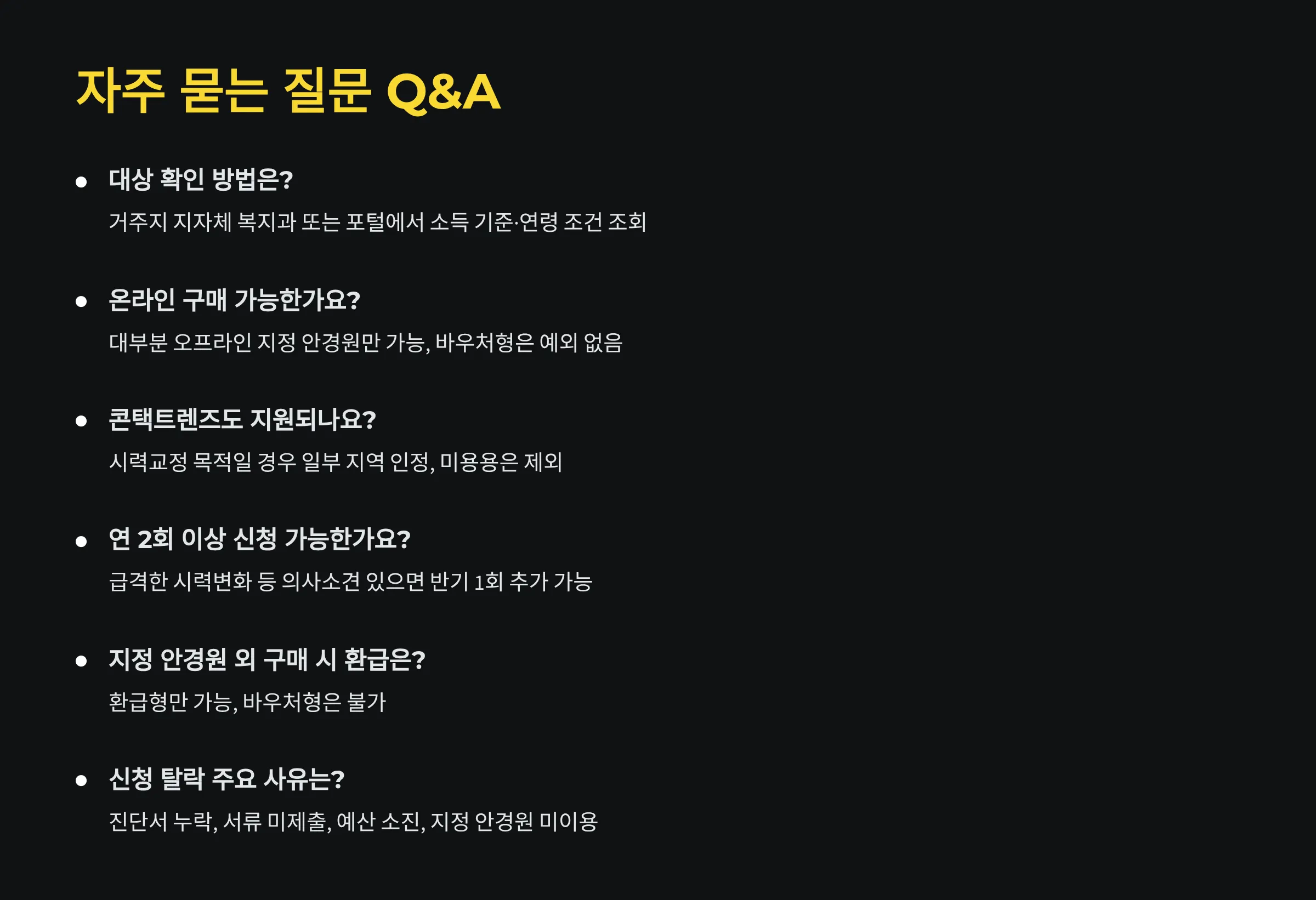| 서울 A구 | 중위소득 100% 이하 | 20만 원 | 바우처형 | 지정 안경원 필수 |