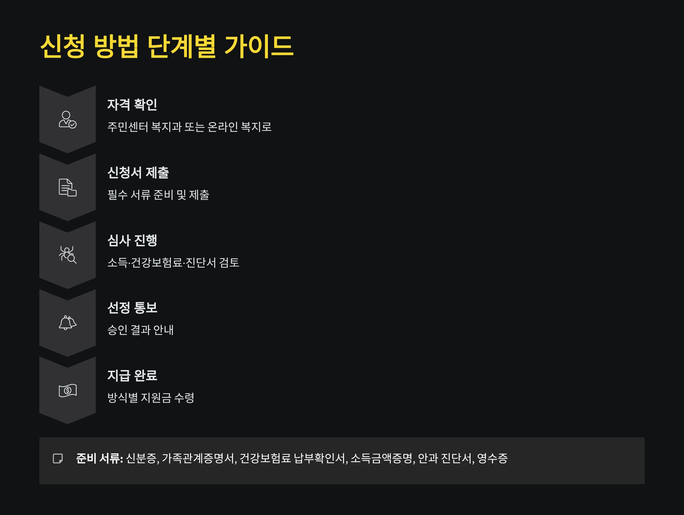 주민센터 복지과 또는 구청, 온라인 복지로 사이트를 통해 신청할 수 있습니다. 절차는 자격확인 → 신청서 제출 → 소득 및 건강보험료 검토 → 진단서 확인 → 선정 통보 → 지급 단계로 진행됩니다. 준비서류는 신분증, 가족관계증명서, 건강보험료 납부확인서, 소득금액증명, 안과 진단서 및 영수증입니다. 일부 지역은 지정 안경원 이용확인서가 필수입니다.