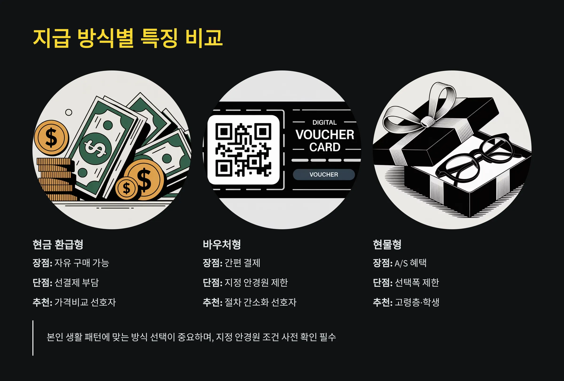 환급형은 본인이 선결제 후 영수증을 제출하면 환급받는 방식이고, 바우처형은 지정 안경원에서 QR코드나 카드로 바로 결제합니다. 현물형은 제휴 안경원에서 무료 교체 또는 할인 형태로 진행됩니다.