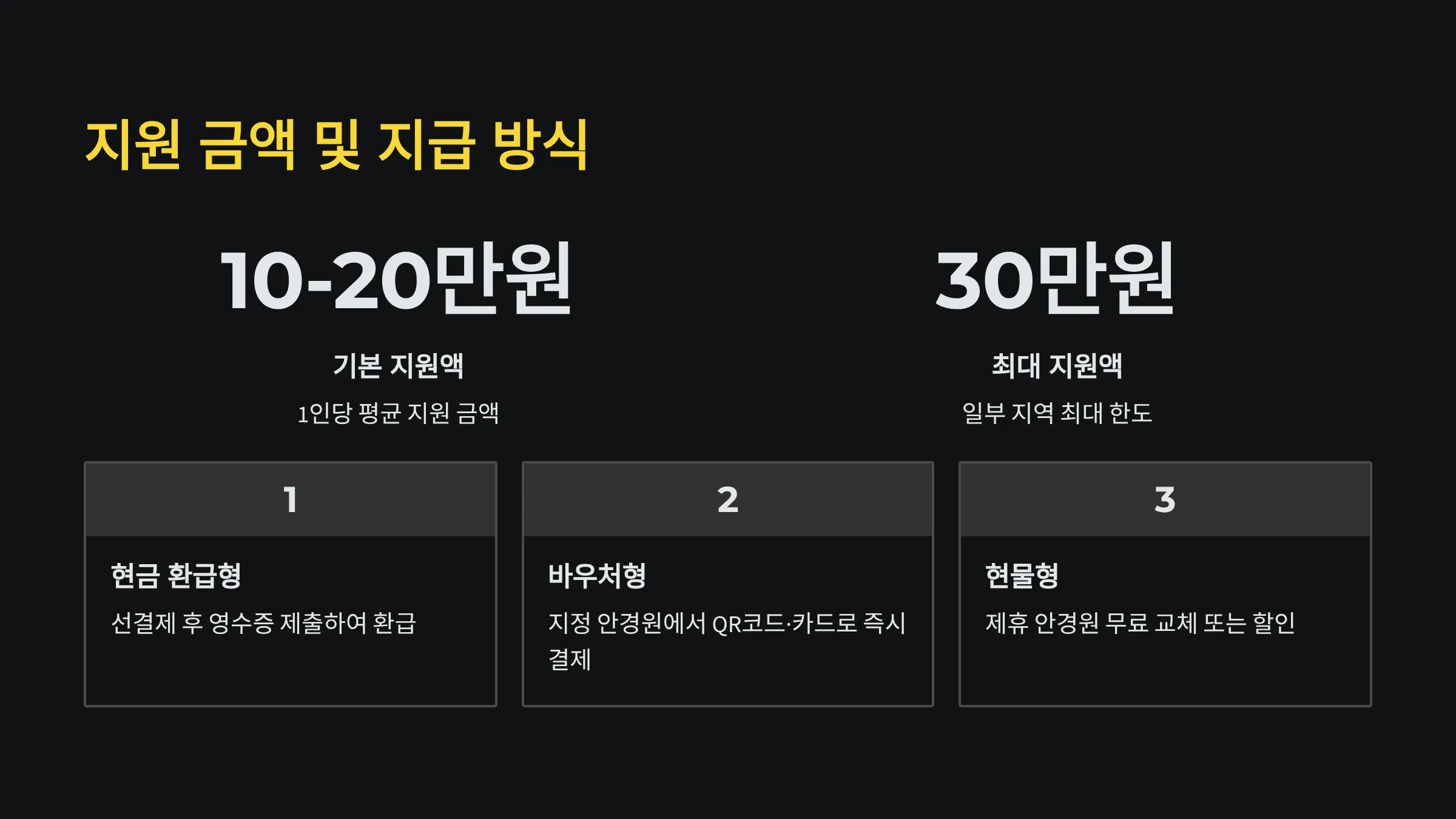 안경 정부지원금은 대체로 1인당 10~20만 원, 일부 지역은 최대 30만 원까지 지원합니다. 방식은 현금 환급형, 바우처형, 현물형으로 구분됩니다.