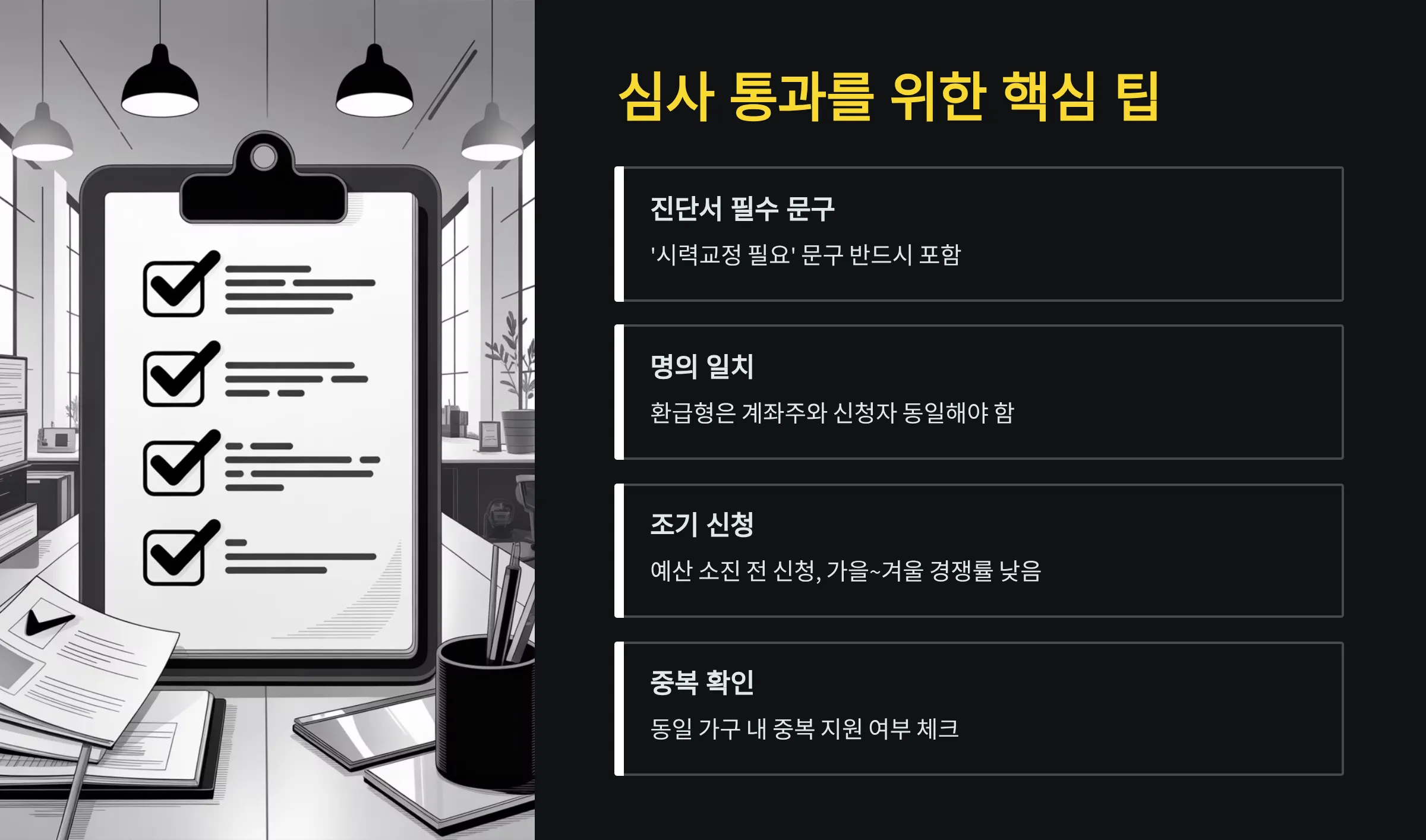 진단서에는 반드시 ‘시력교정 필요’ 문구가 포함되어야 합니다. 가족 명의 결제는 가급적 피하고, 환급형일 경우 계좌주 명의와 신청자가 일치해야 합니다. 예산 소진 전에 조기 신청하는 것이 유리하며, 가을~겨울 학기 전 접수 시 경쟁률이 낮습니다. 또한 동일 가구 내 중복 지원 여부를 확인해야 탈락을 방지할 수 있습니다.