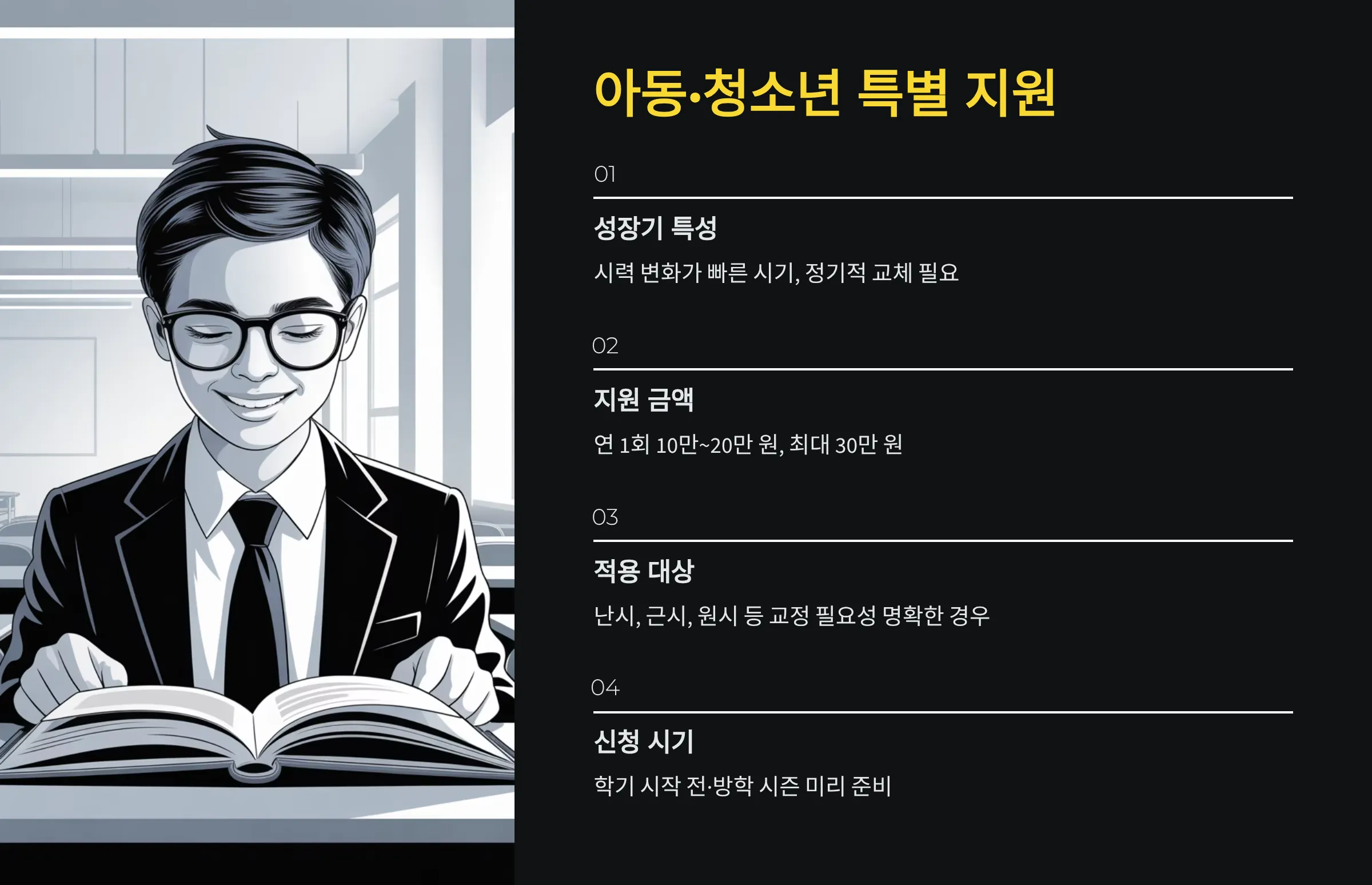 난시, 근시, 원시 등 교정 필요성이 명확하면 30만 원까지 지원하는 지역도 있습니다. 학기 시작 전이나 방학 시즌에는 신청자가 몰리므로, 미리 안과 진단서와 신청서류를 준비하는 것이 중요합니다.