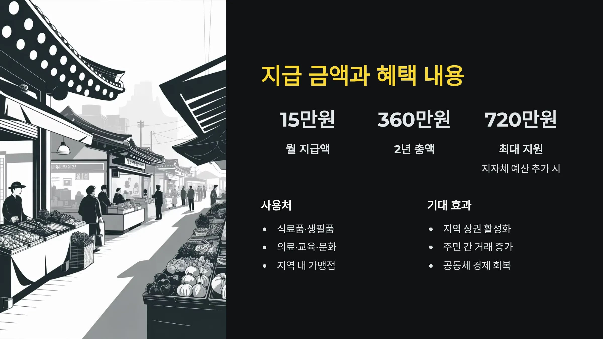 지급 금액은 지역화폐나 모바일 상품권 형태로 제공되며, 지역 내 가맹점에서만 사용할 수 있습니다. 이러한 방식은 소비를 해당 지역 안으로 묶어두어 지역경제 활성화 효과를 높이는 역할을 합니다.