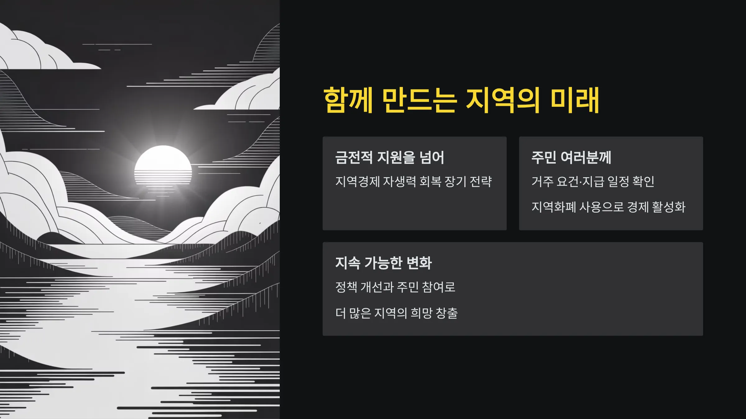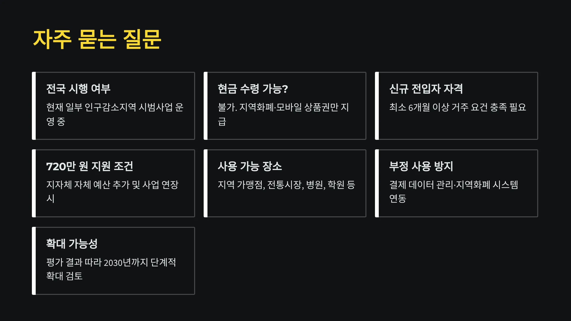 일부 지자체는 지역화폐 가맹점 확대, 전통시장 활성화, 디지털 결제 인프라 확충 등과 병행하여 사업의 효율을 높이고 있습니다. 또한 청년 귀촌 정책과 연계해 창업 지원, 농촌 주거 개선 등 복합형 지원사업으로 확장하는 추세입니다.