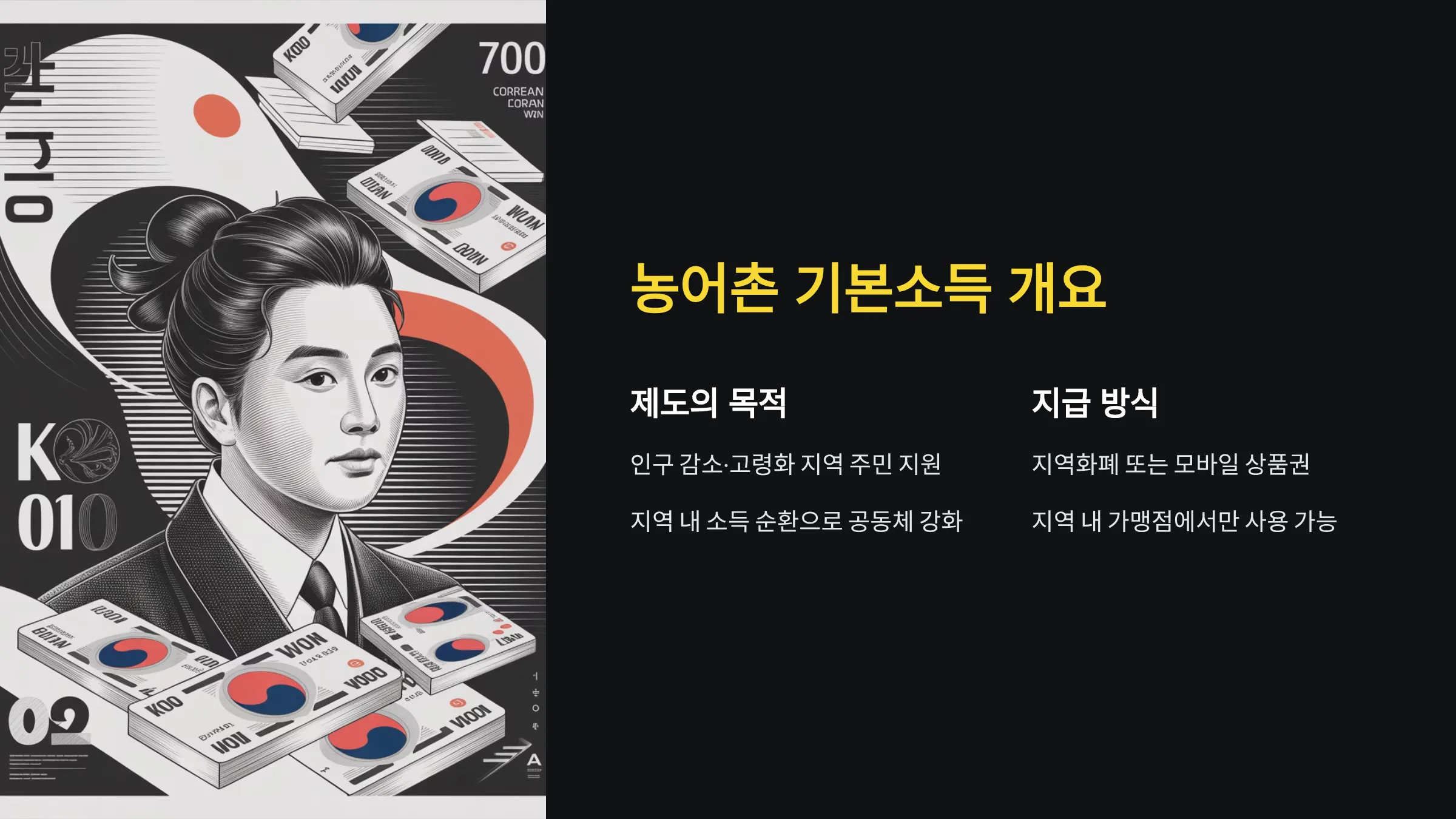 농어촌 기본소득은 인구 감소와 고령화로 어려움을 겪고 있는 농어촌 지역의 주민들에게 일정 금액을 지급하는 제도입니다. 이는 단순한 복지 지원을 넘어, 지역 안에서 소득이 순환되도록 하여 공동체 기반을 강화하는 것을 목표로 하고 있습니다.
