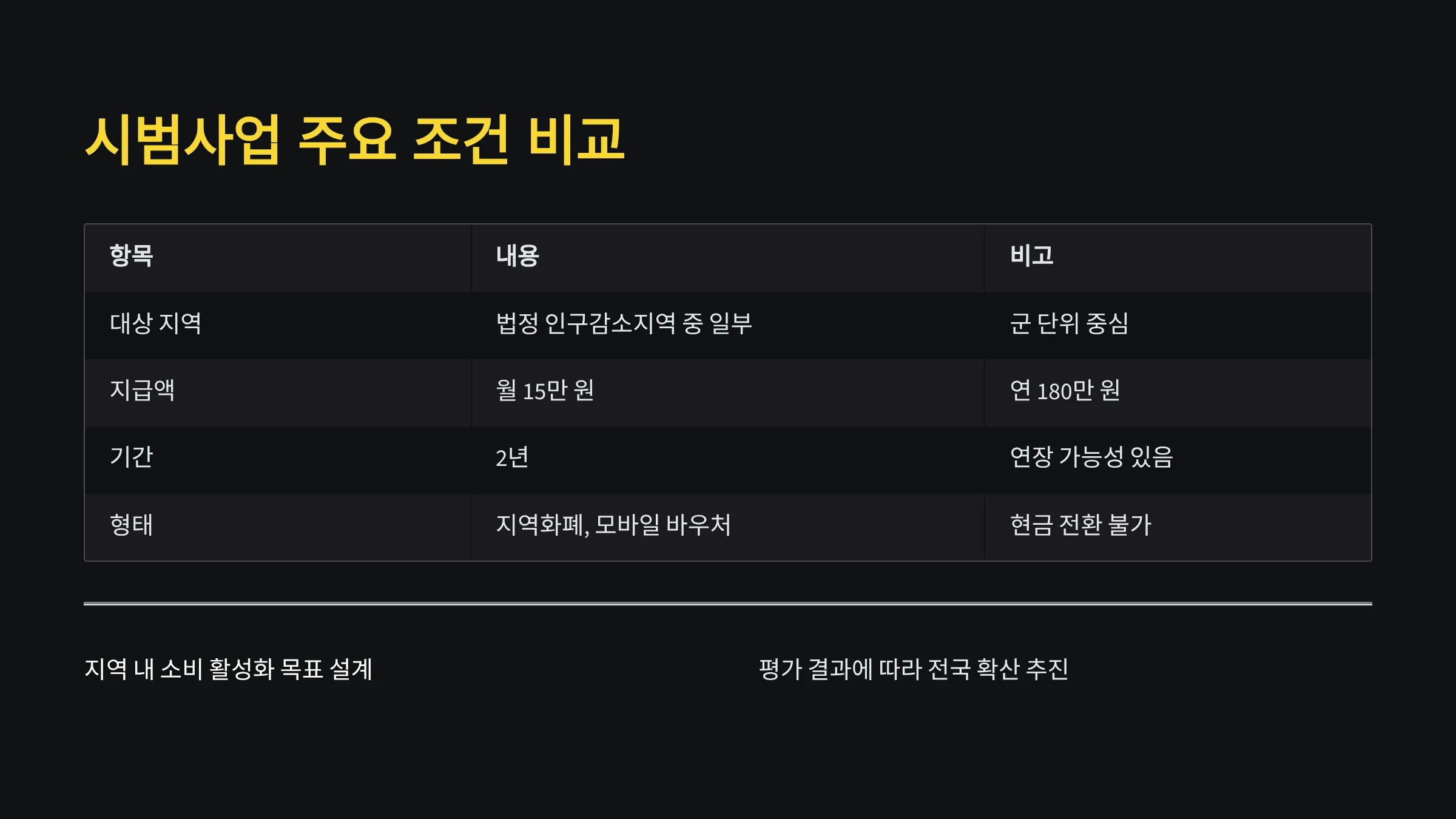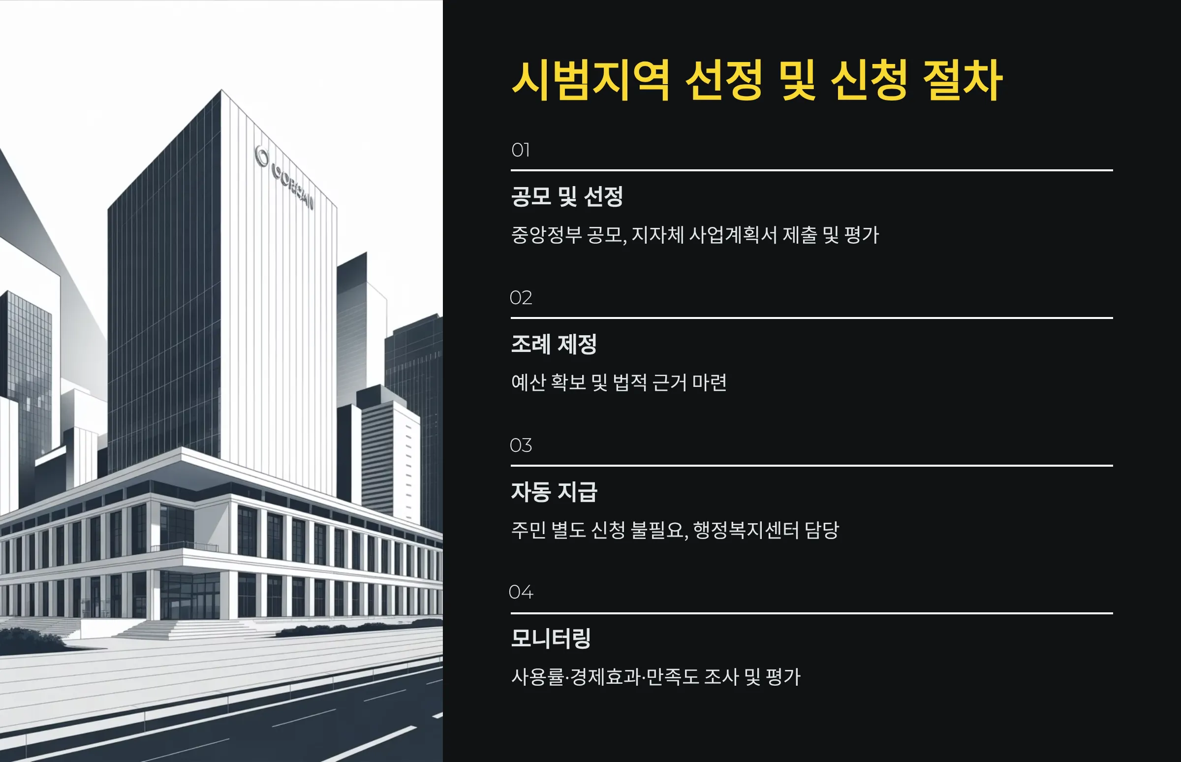 시범지역은 중앙정부가 공모를 통해 선정하며, 각 지자체가 사업계획서를 제출하고 평가를 거쳐 결정됩니다. 이후 조례 제정과 예산 확보를 마치면 실제 사업이 시작됩니다. 주민들은 별도의 신청 없이 자동으로 지급 대상이 됩니다.