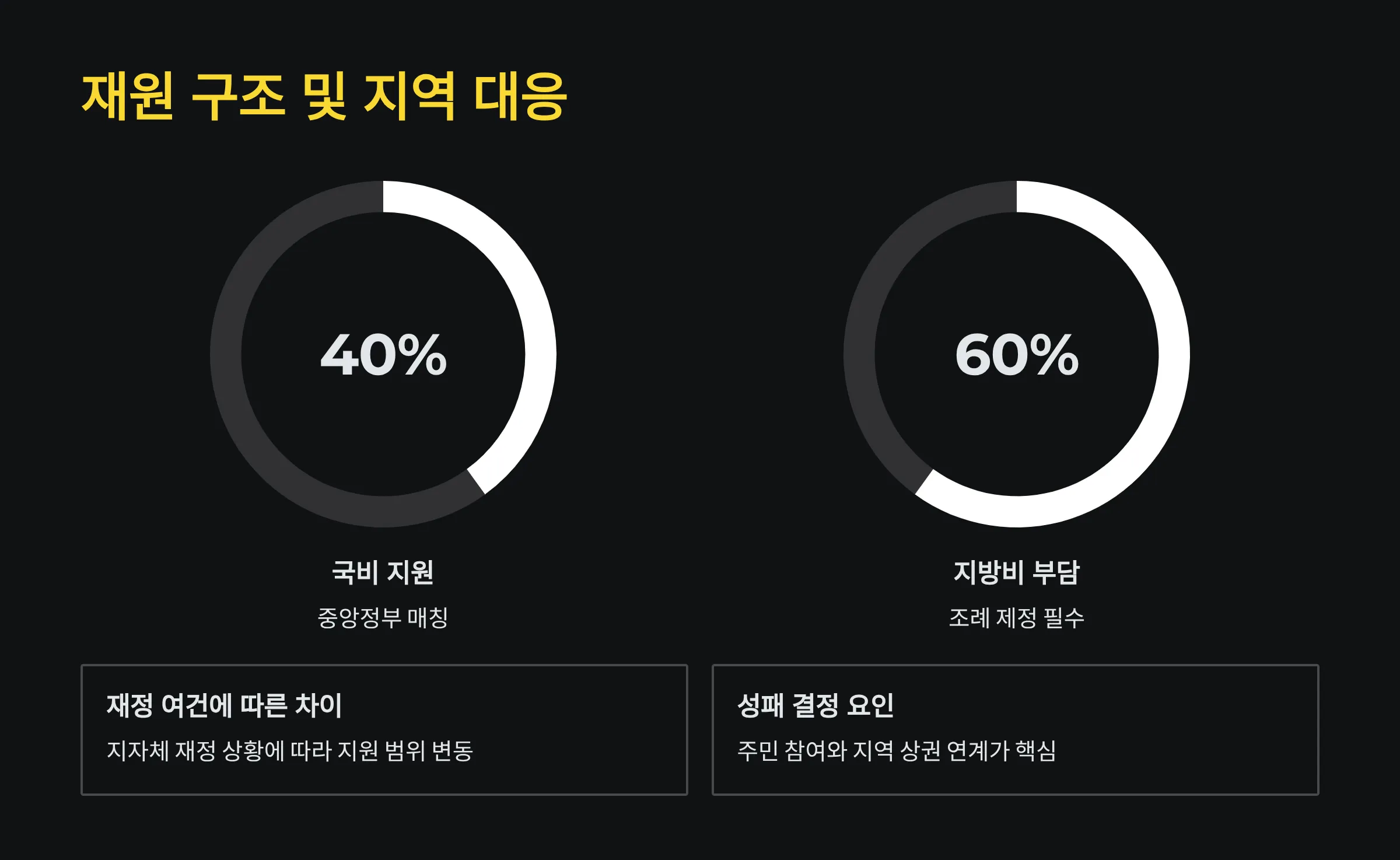 국비와 지방비 매칭 구조로 진행되며, 지자체의 재정 여건에 따라 지원 범위가 달라집니다.