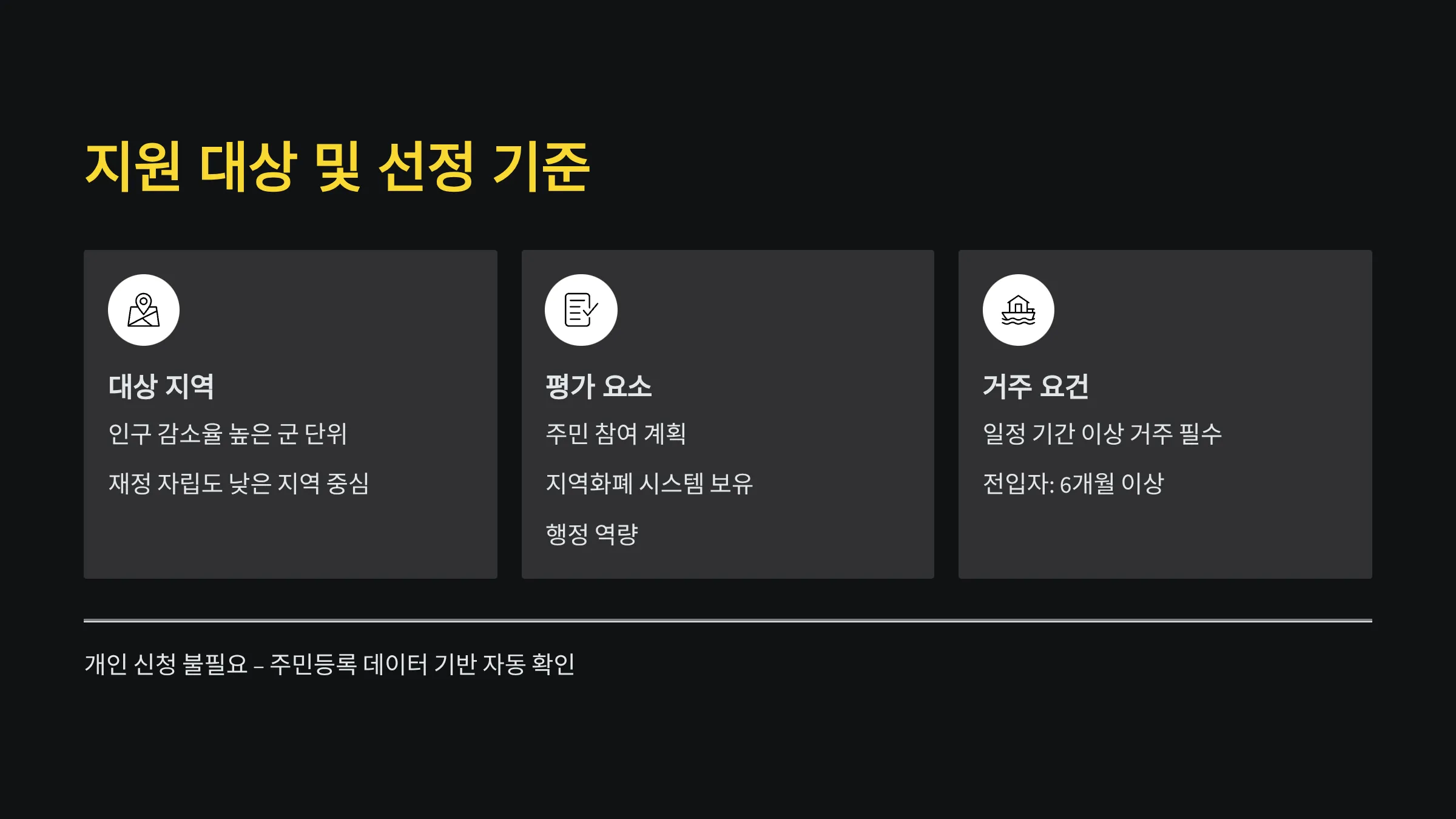 개인 신청 절차는 별도로 없으며, 행정기관이 주민등록 데이터를 기반으로 자격을 자동 확인합니다. 전입자의 경우 6개월 이상 거주 요건을 충족해야 하며, 거주 중단 시 지급이 중단될 수 있습니다.