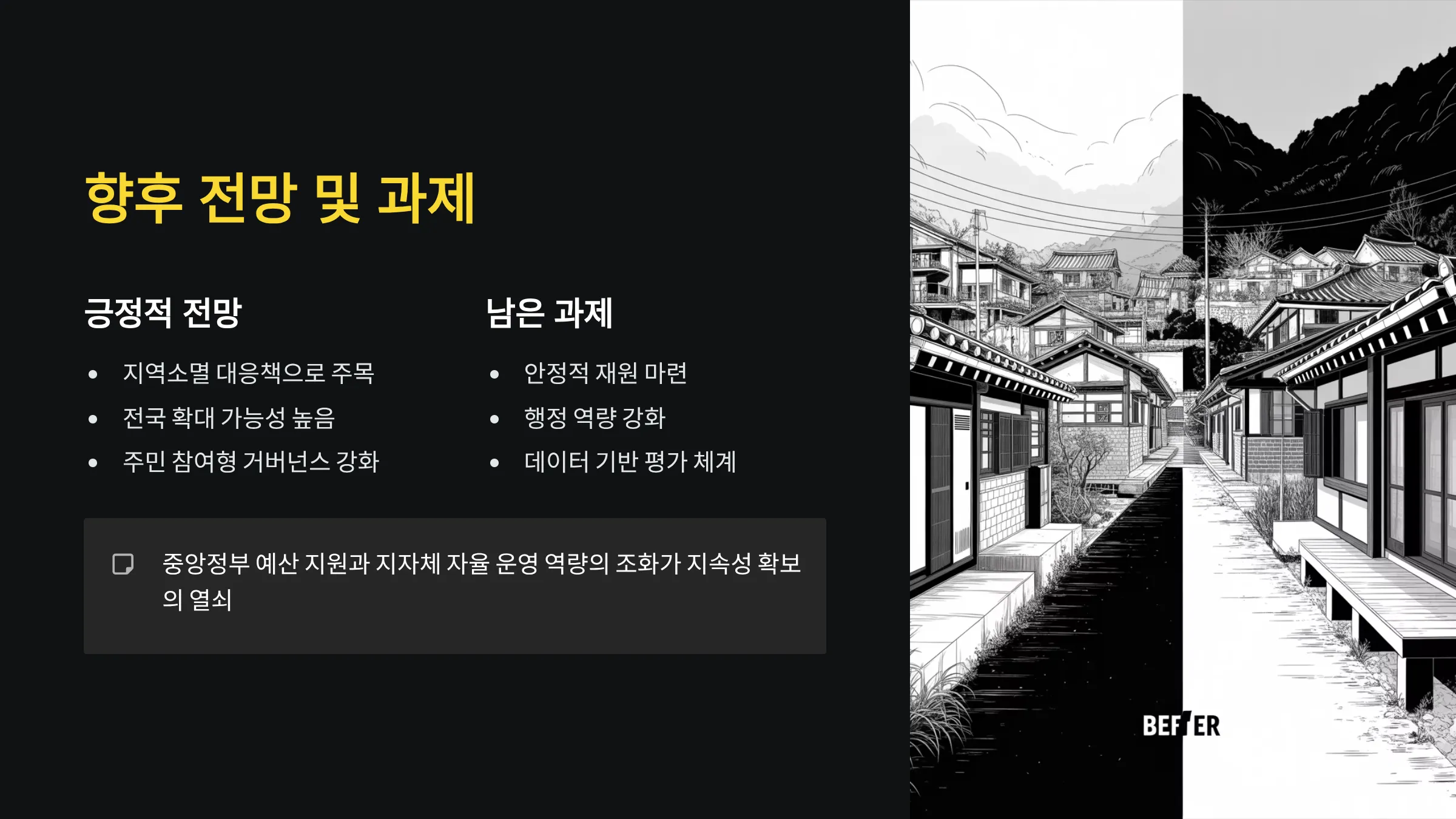 농어촌 기본소득은 지역소멸 대응책으로 주목받고 있으며, 향후 전국 확대 가능성이 높습니다. 다만 재원 마련, 행정 역량, 데이터 기반 평가 체계 구축 등은 여전히 과제로 남아 있습니다.