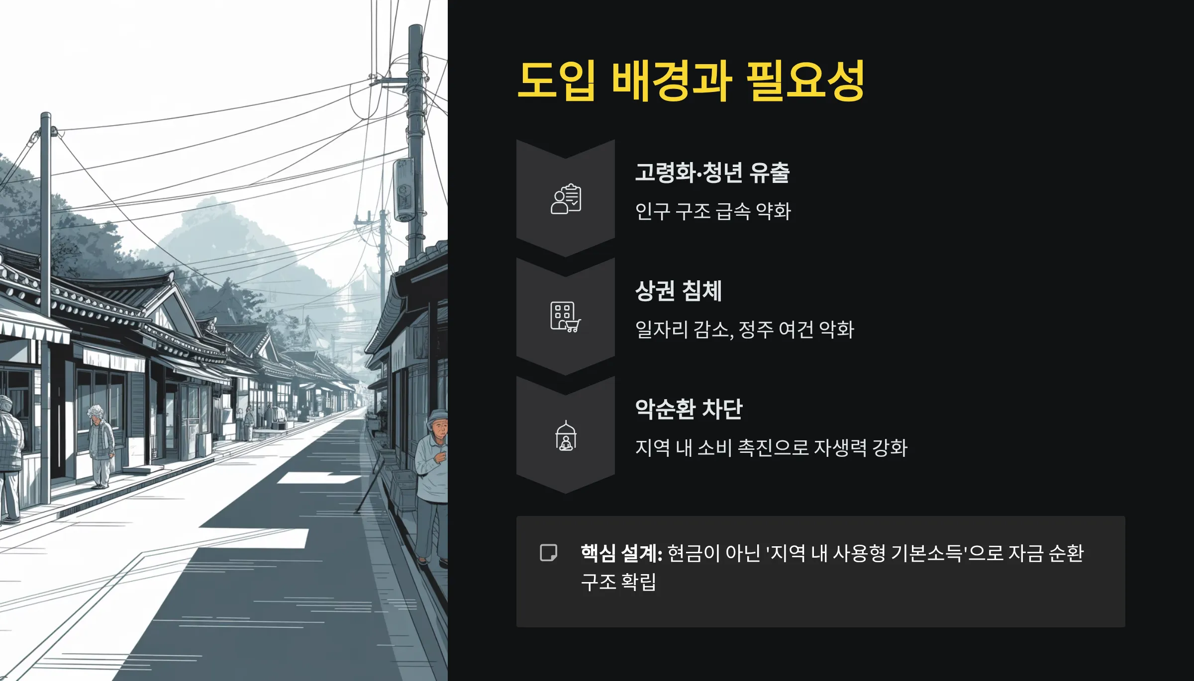 특히 현금성 지원이 아닌 ‘지역 내 사용형 기본소득’으로 설계된 점이 핵심입니다. 주민들이 지역 상권을 이용함으로써 자금이 순환되고, 동시에 공동체의 자생력을 강화할 수 있는 구조입니다.